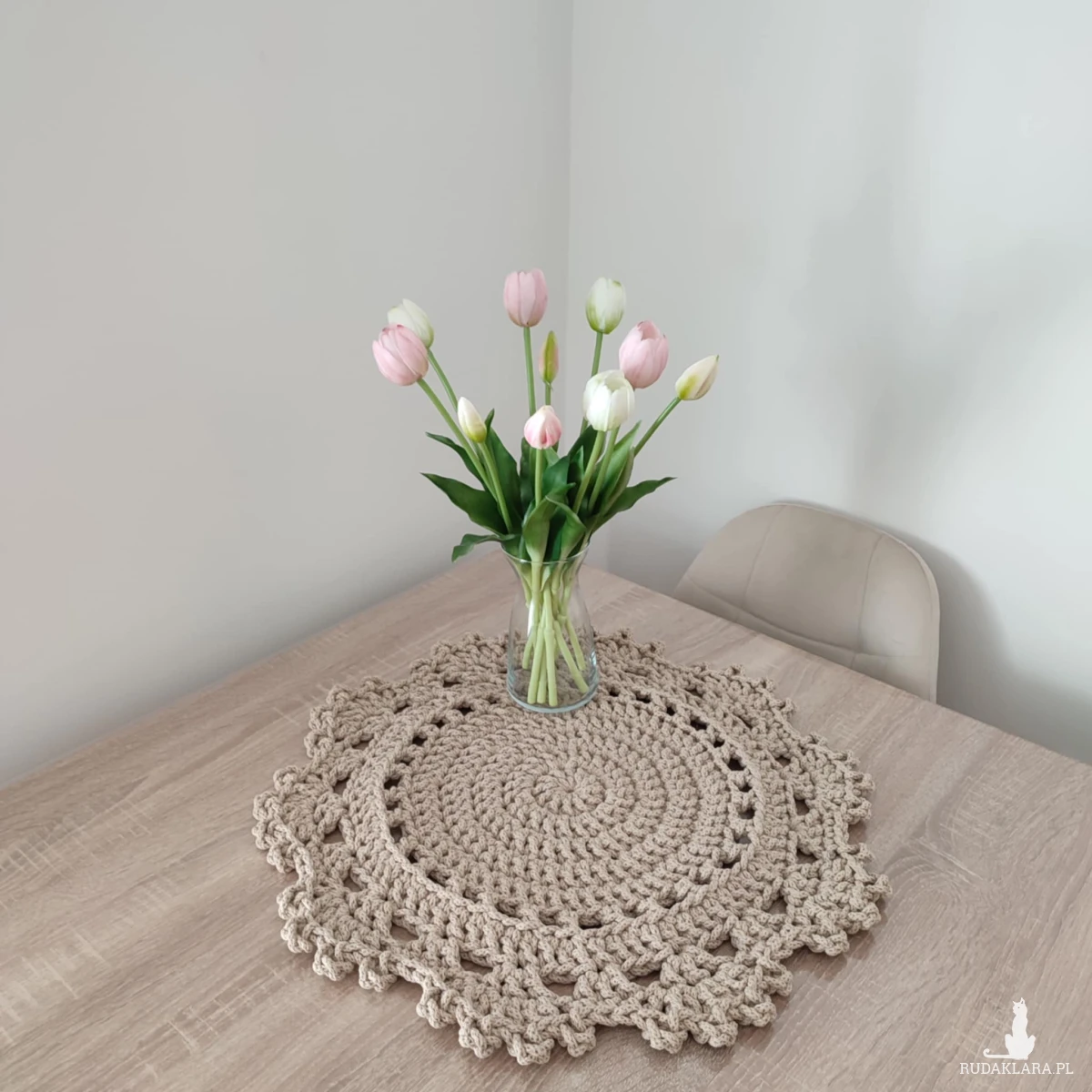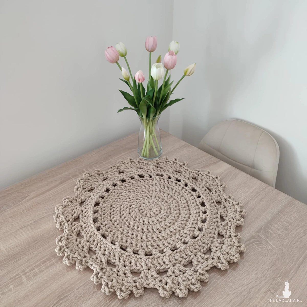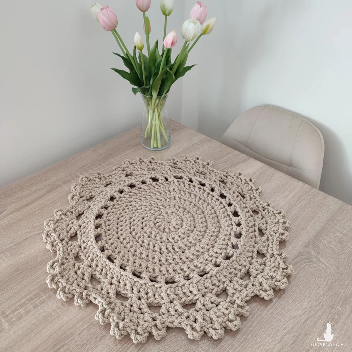 Podkładka o średnicy 50cm, wykonana metodą szydełkowania z polskiego sznurka bawełnianego 5mm.