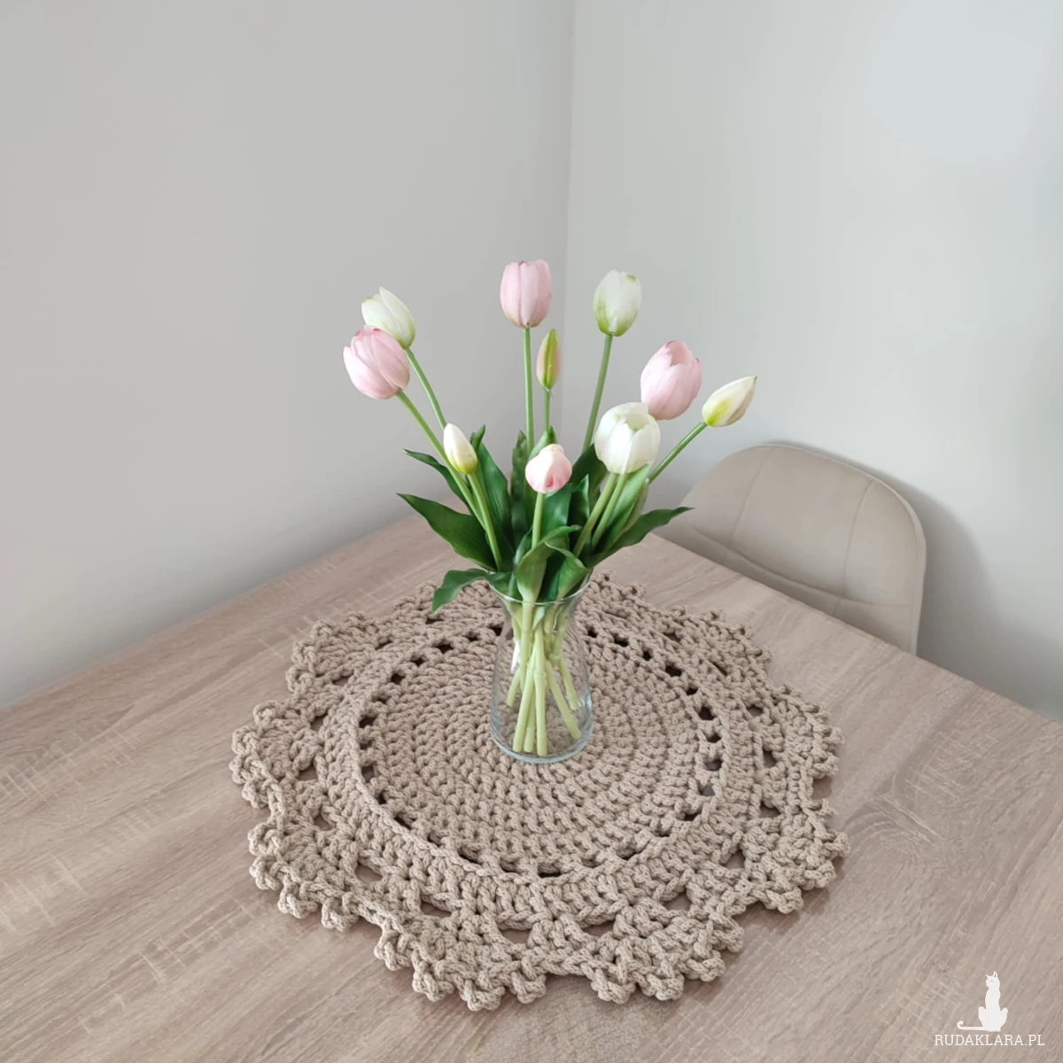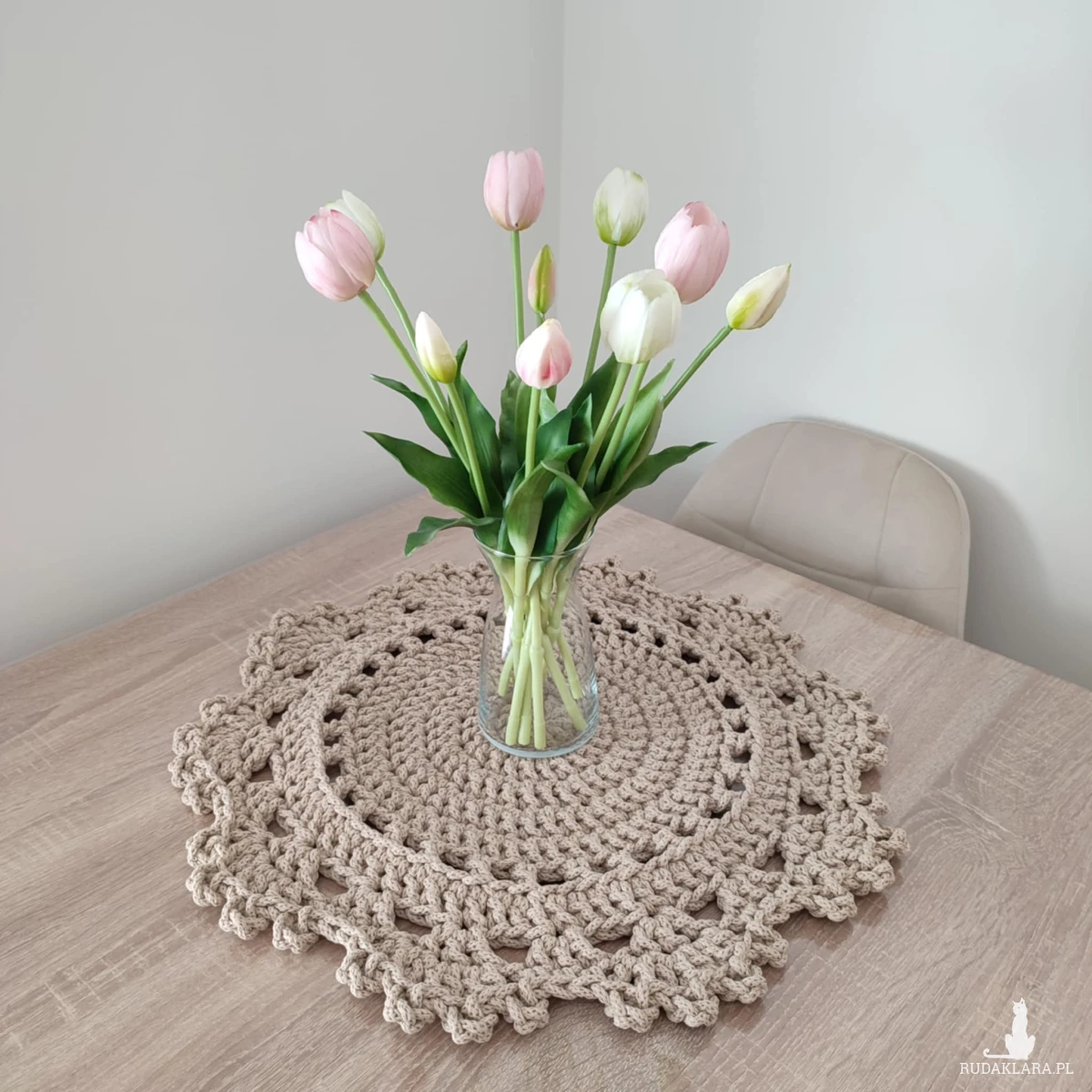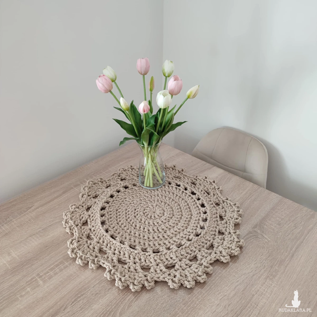 Podkładka o średnicy 50cm, wykonana metodą szydełkowania z polskiego sznurka bawełnianego 5mm.