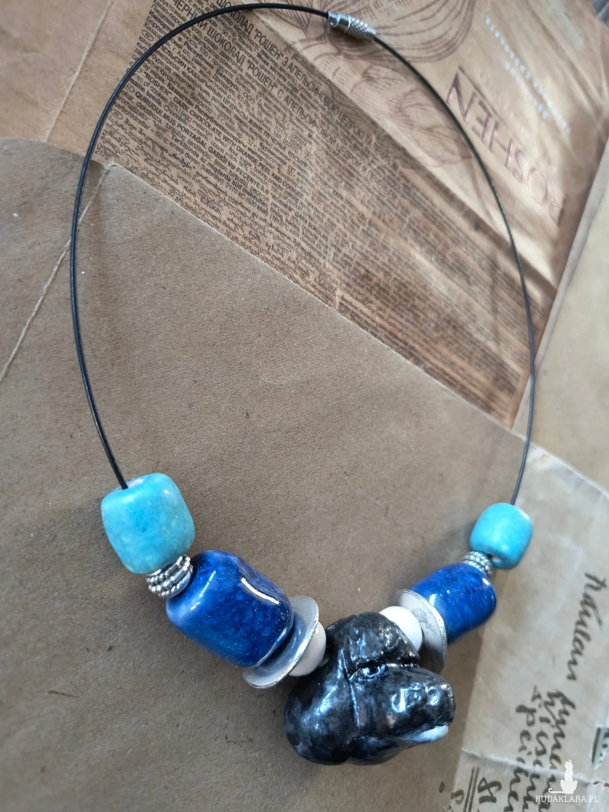 Naszyjnik na drucianej kolii złożony z ceramicznych koralików z motywem pudelka wykonanych 100 % hand made. Serdecznie polecam.