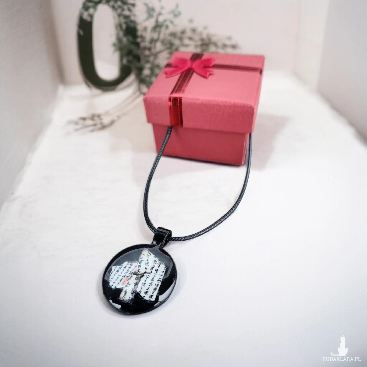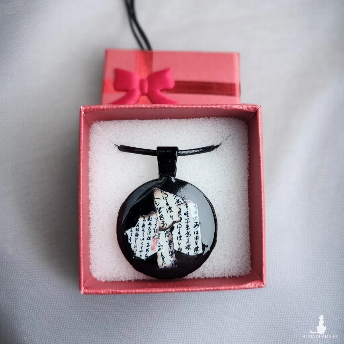 Wyjątkowy naszyjnik wykonany ręcznie z wysokiej jakości żywicy epoksydowej. Wewnątrz wisiora znajduje się artystyczna kompozycja z fragmentami papieru z kaligrafią, tworząca niepowtarzalny, głęboki efekt. Każdy egzemplarz jest jedyny w swoim rodzaju – nie ma dwóch identycznych naszyjników.