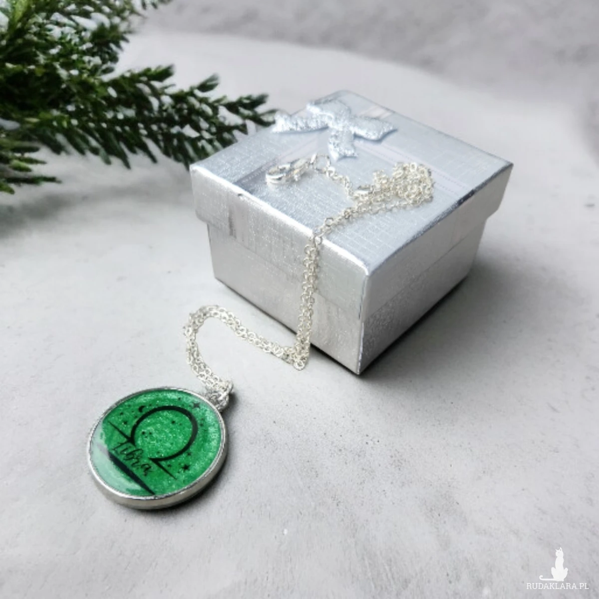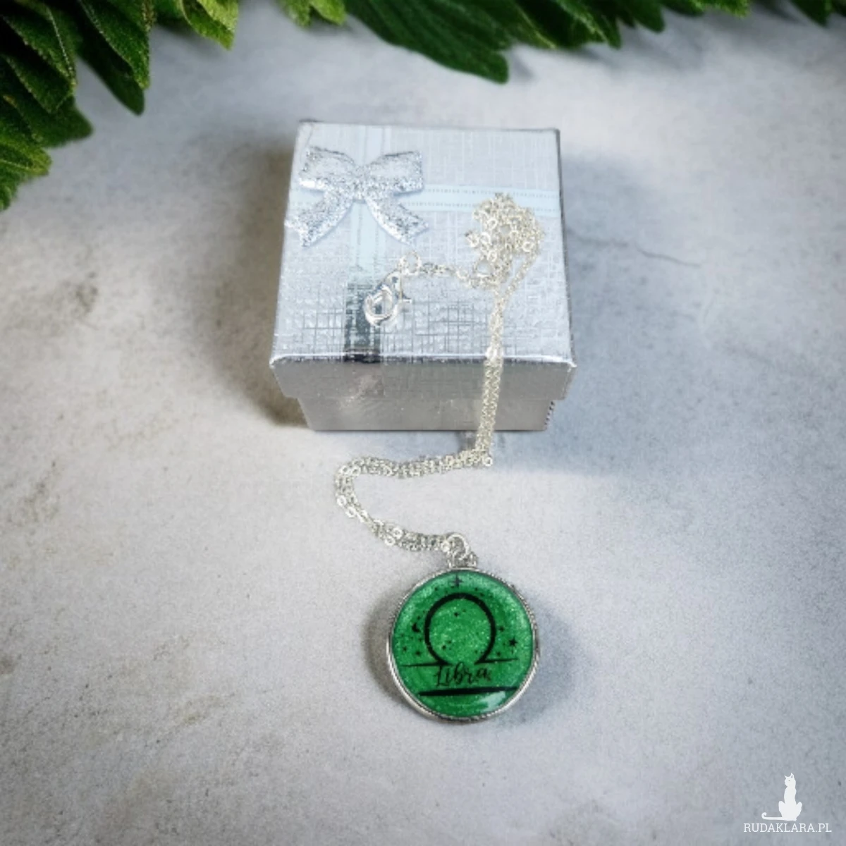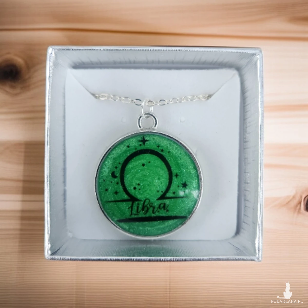 Przepiękny, ręcznie wykonany naszyjnik z motywem znaku zodiaku Waga to idealny prezent dla osób urodzonych między 23 września a 22 października. Medalion w odcieniach intensywnej zieleni z delikatnym brokatowym połyskiem został ozdobiony symbolem Wagi oraz subtelnymi akcentami gwiazd, tworząc wyjątkowy, kosmiczny charakter.