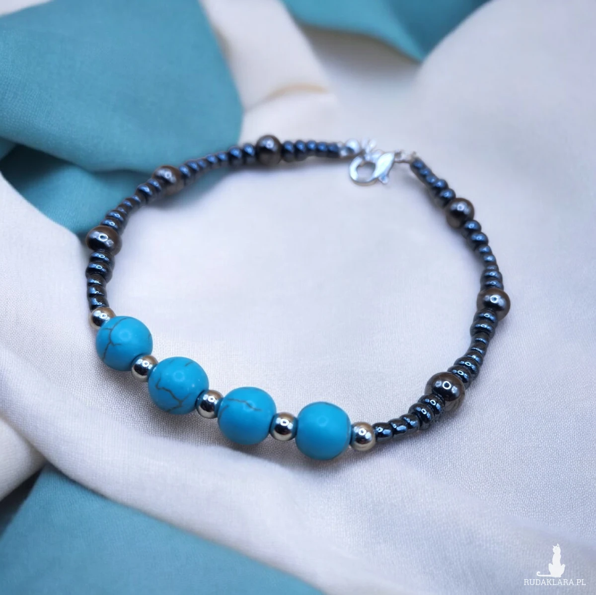Stylowa, ręcznie wykonana bransoletka o nowoczesnym charakterze. Połączenie intensywnego turkusu z połyskującymi, grafitowymi koralikami nadaje jej elegancki i uniwersalny wygląd. Subtelny design sprawia, że bransoletka doskonale uzupełni zarówno codzienne stylizacje, jak i bardziej elegancki strój.