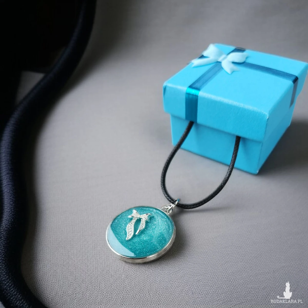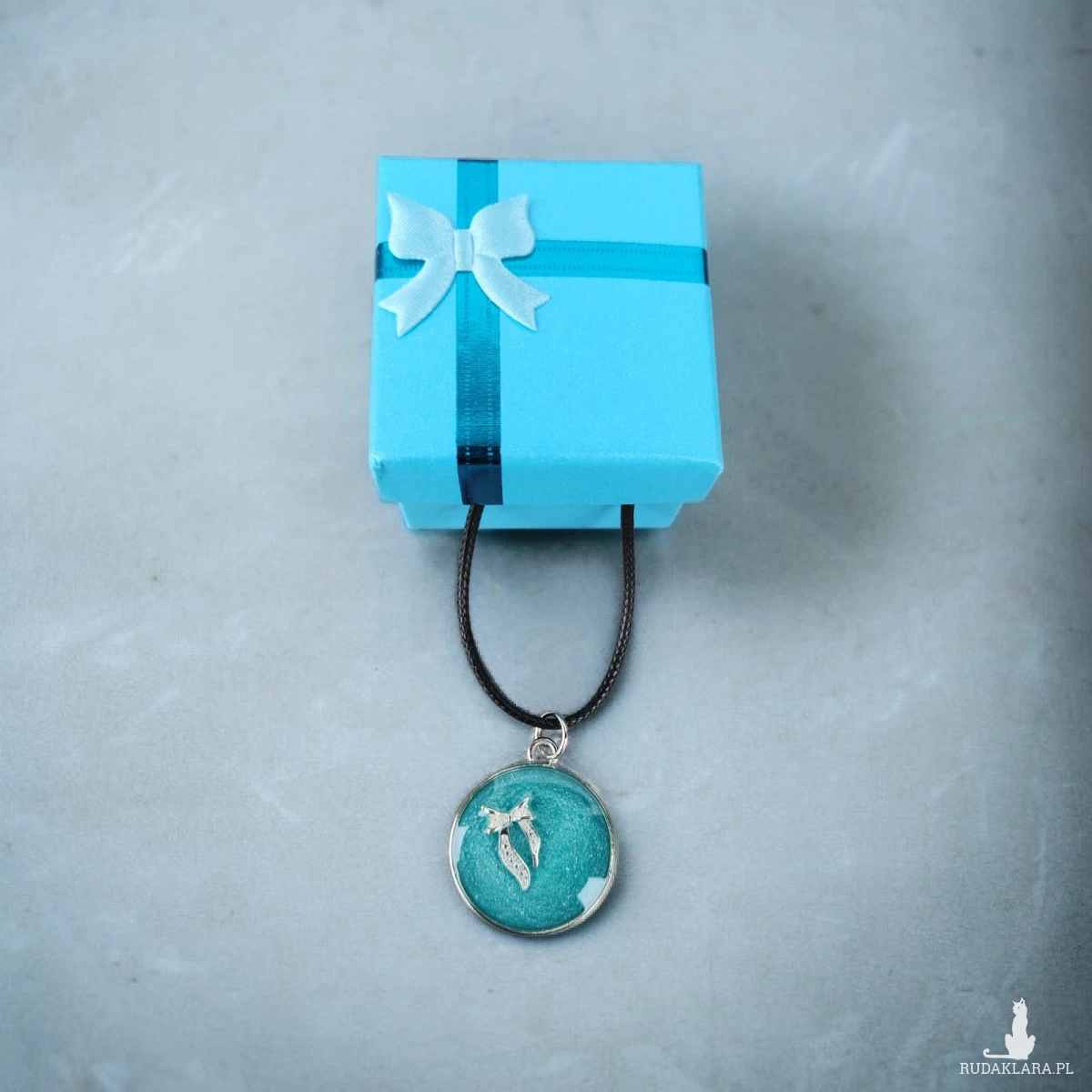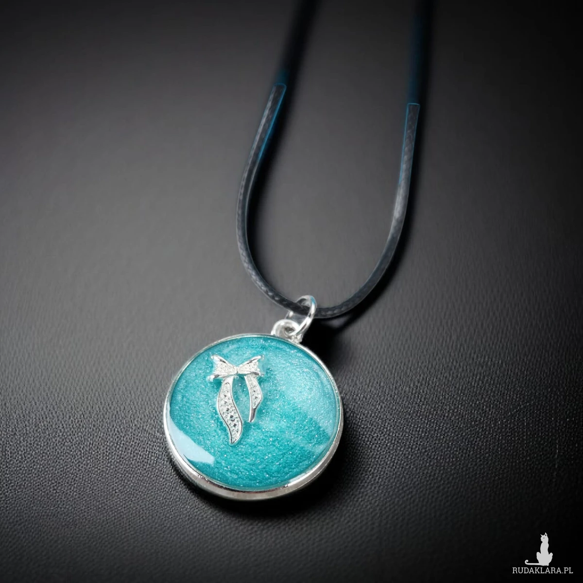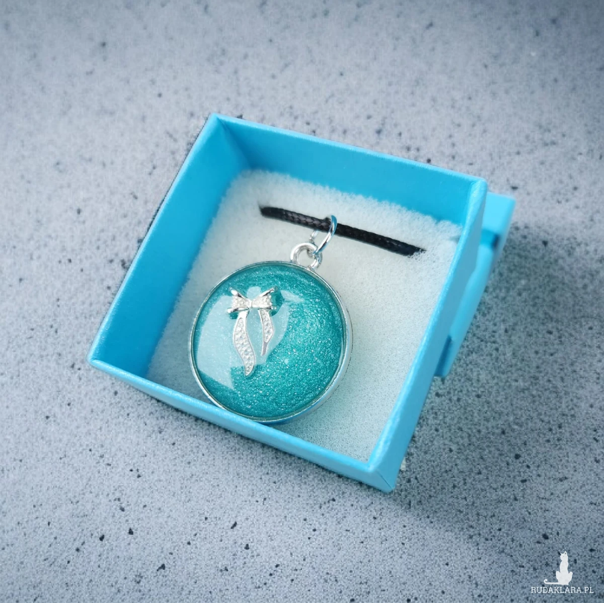 Wyjątkowy, ręcznie wykonany naszyjnik z żywicy epoksydowej, który zachwyca subtelnym blaskiem i elegancją. Okrągły medalion w odcieniu turkusu z delikatnym, mieniącym się efektem został ozdobiony srebrną kokardą, symbolizującą lekkość, wdzięk i kobiecość.