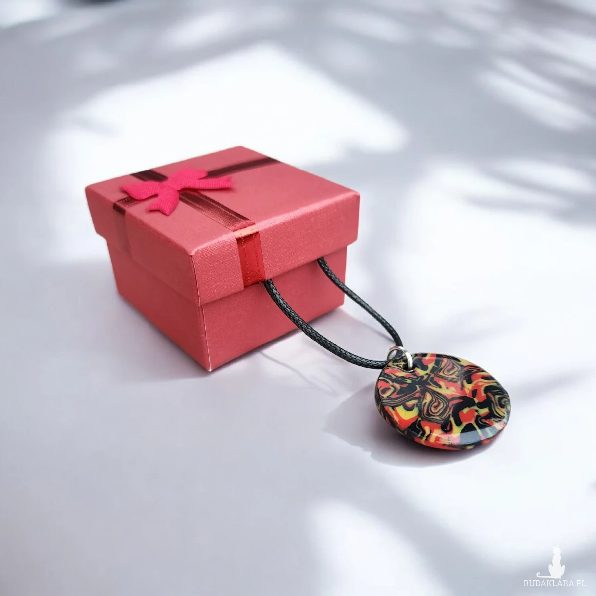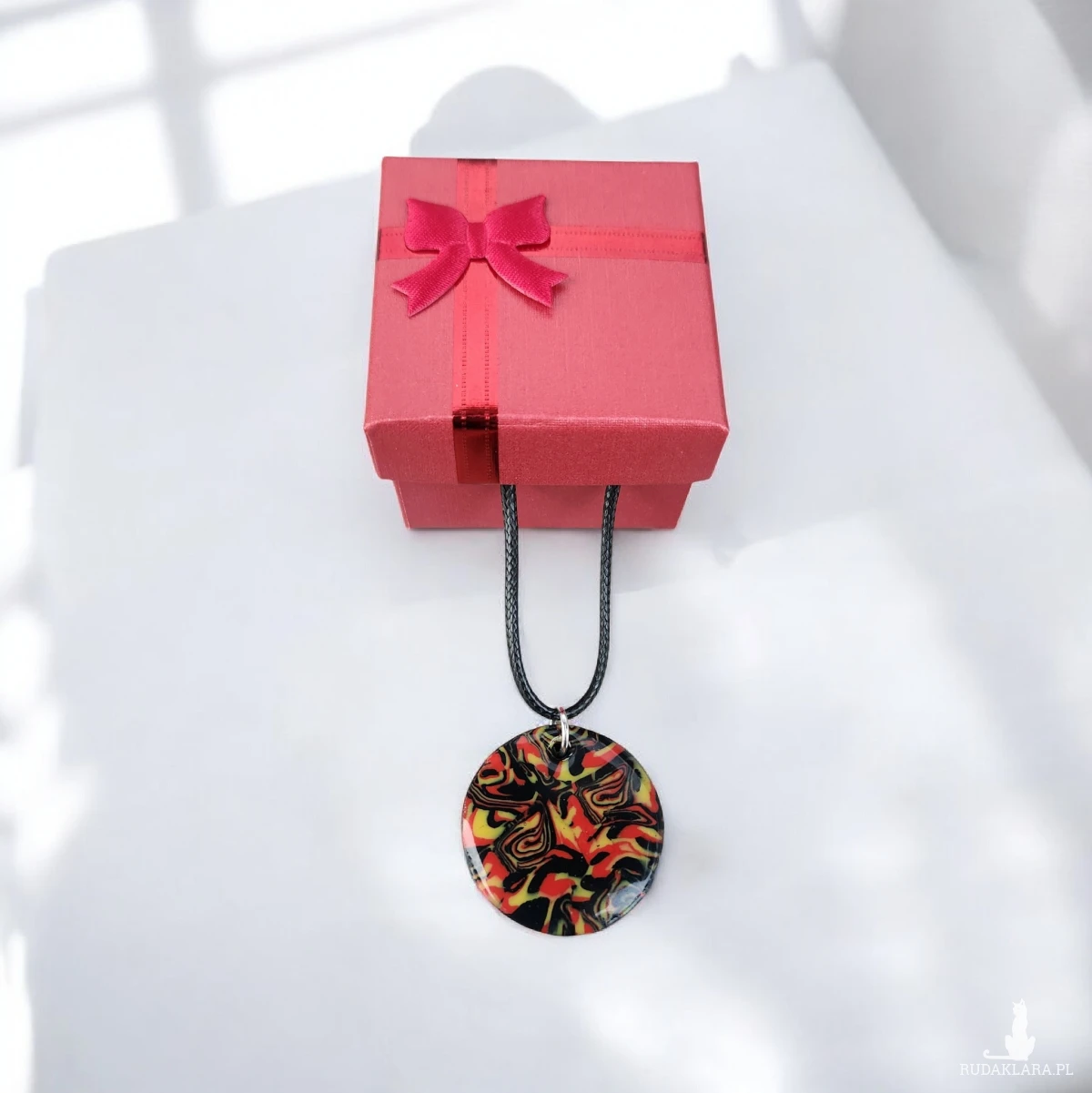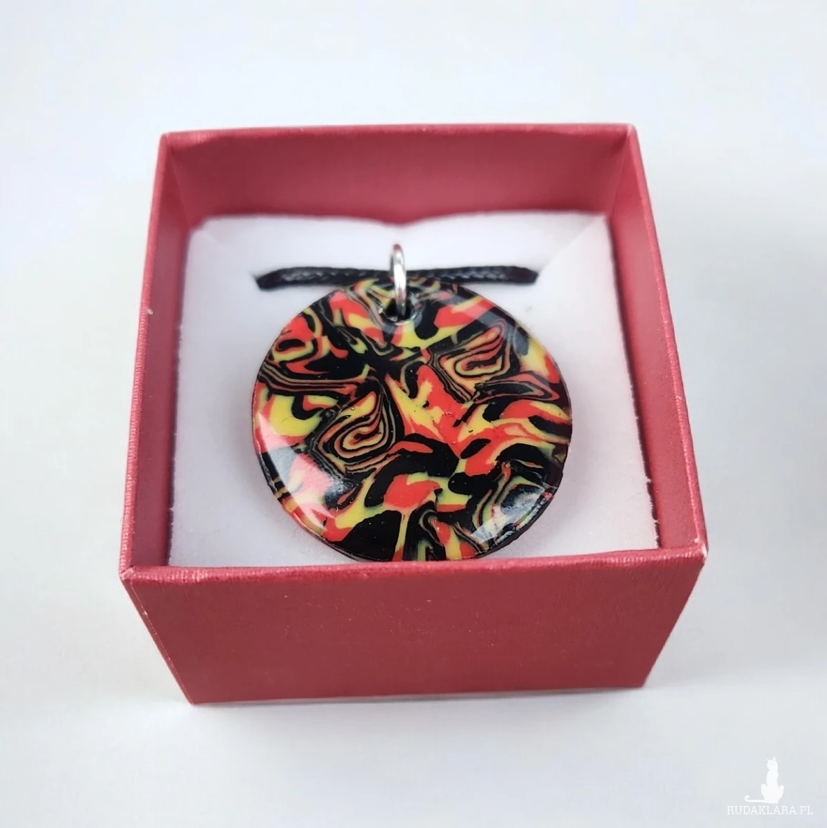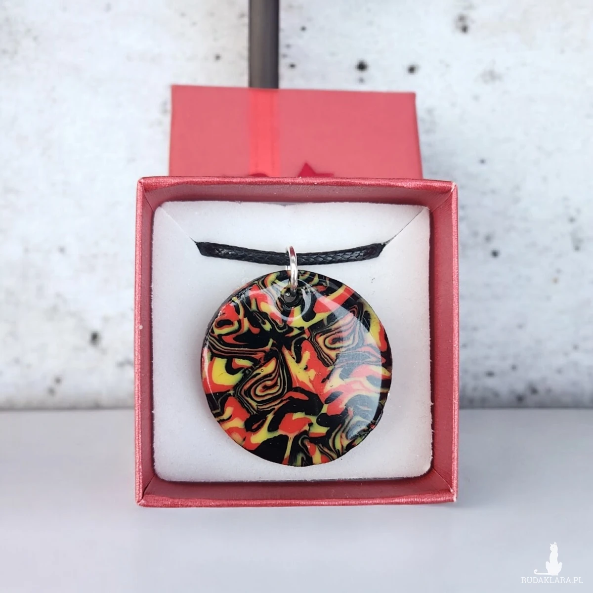 Sprzedam wyjątkowy, ręcznie wykonany naszyjnik z gliny polimerowej i żywicy. Okrągły wisior posiada abstrakcyjny wzór w intensywnych kolorach: czerwieni, żółci i czerni. Każdy egzemplarz jest jedyny w swoim rodzaju – dokładnie ten ze zdjęcia.