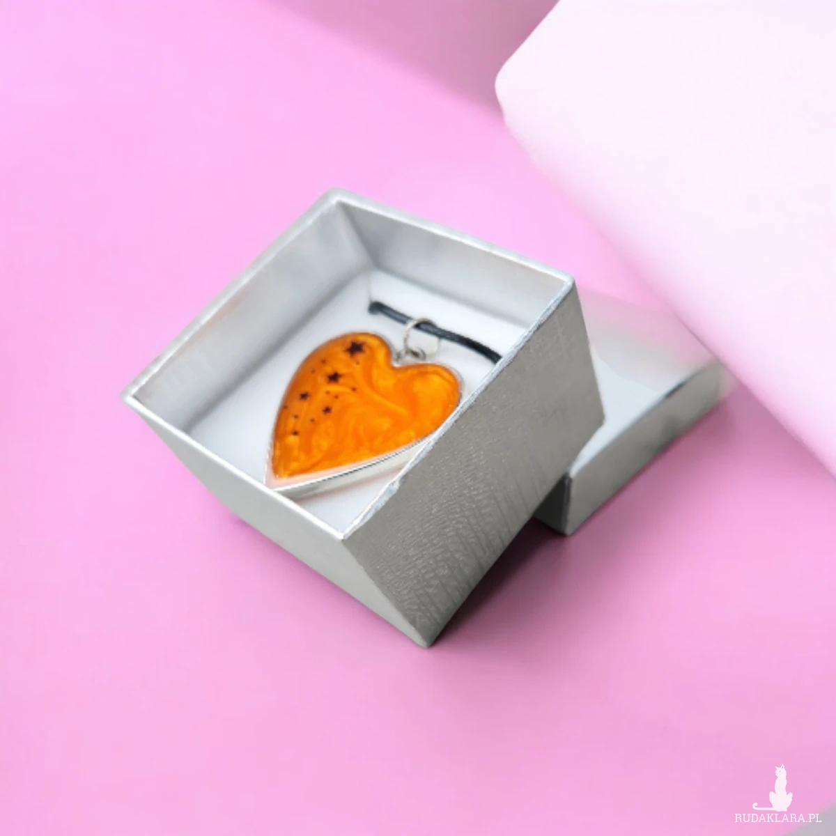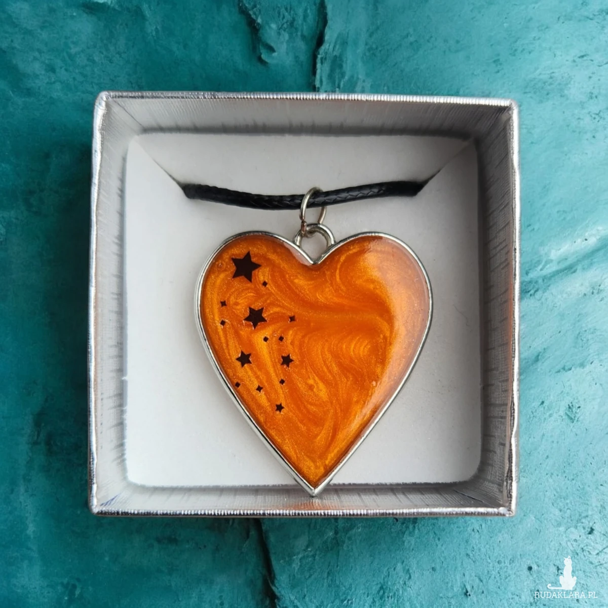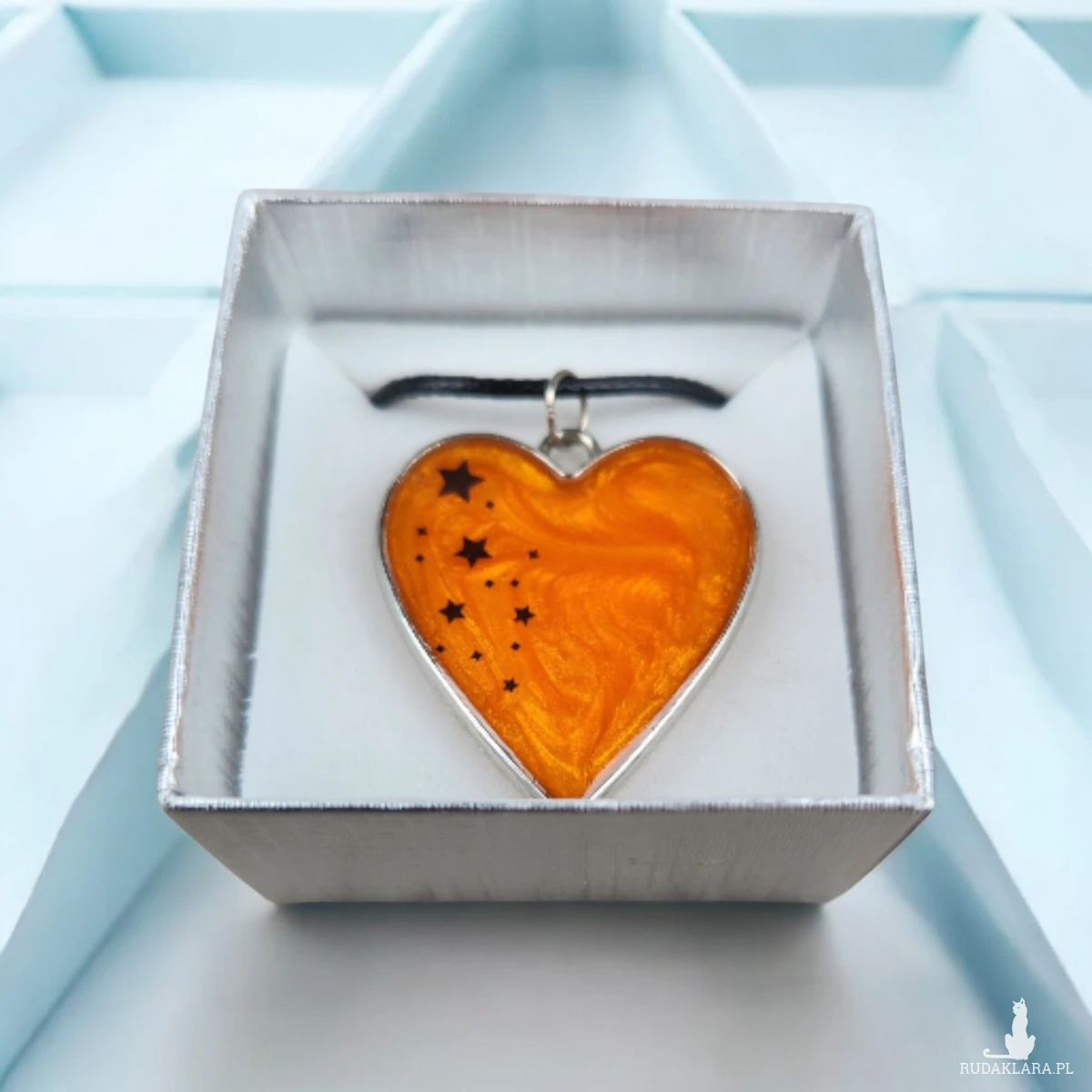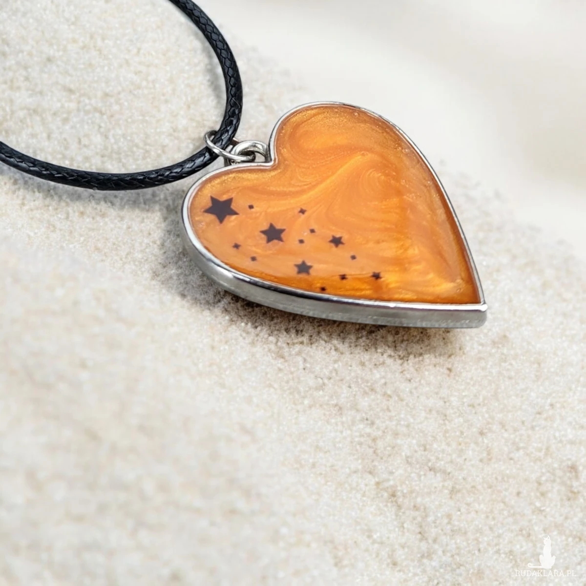 Wnieś odrobinę magii do swojej codzienności dzięki temu wyjątkowemu naszyjnikowi w kształcie serca. Wypełniony intensywną, pomarańczową żywicą o perłowym połysku i ozdobiony czarnymi gwiazdkami, tworzy niepowtarzalny efekt miniaturowej galaktyki zamkniętej w biżuterii.