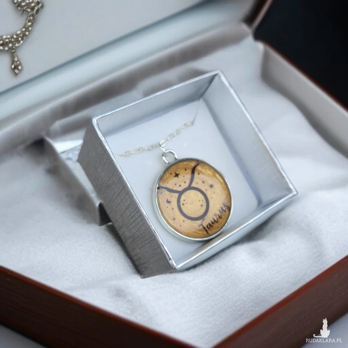 Ten wyjątkowy wisiorek został ręcznie wykonany z wysokiej jakości żywicy, tworząc trwałą i piękną formę, która zachwyca ciepłym, złocistym tłem. W jego centrum znajduje się symbol zodiaku Taurus (Byk), otoczony delikatnymi gwiazdkami i księżycem, co nadaje całości subtelnego, astrologicznego charakteru. Każdy egzemplarz jest odlewany indywidualnie, dlatego układ barw i drobnych detali może się nieznacznie różnić, czyniąc biżuterię absolutnie niepowtarzalną.