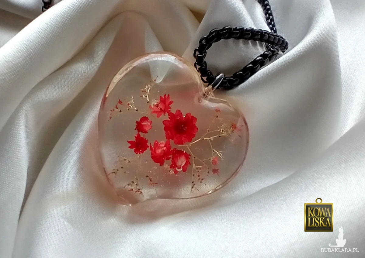 Duże, żywiczne serce z zatopionymi wewnątrz czerwonymi kwiatuszkami na cierniowych gałązkach.