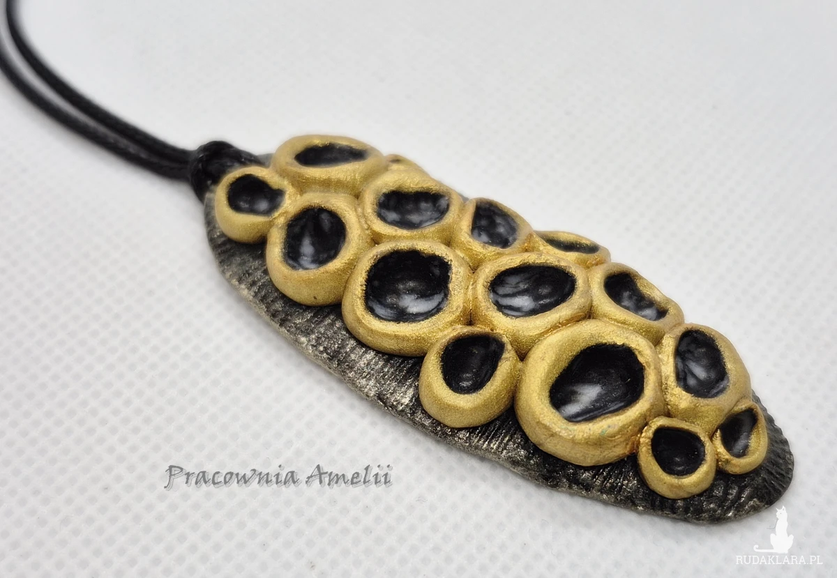 Wisior wykonany z gliny polimerowej zawieszony na czarnym powlekanym sznurku zapinanym na karabińczyk (z łańcuszkiem regulacyjnym). Wisior ma strukturę przywodzącą na myśl plaster miodu lub suszony kwiat lotosu. Ładnie prezentuje się na dekolcie. Projekt własny, wykonany tylko w jednym egzemplarzu. Biżuteria z gliny polimerowej jest trwała i uniwersalna. Idealna na oryginalny prezent w atrakcyjnej cenie.