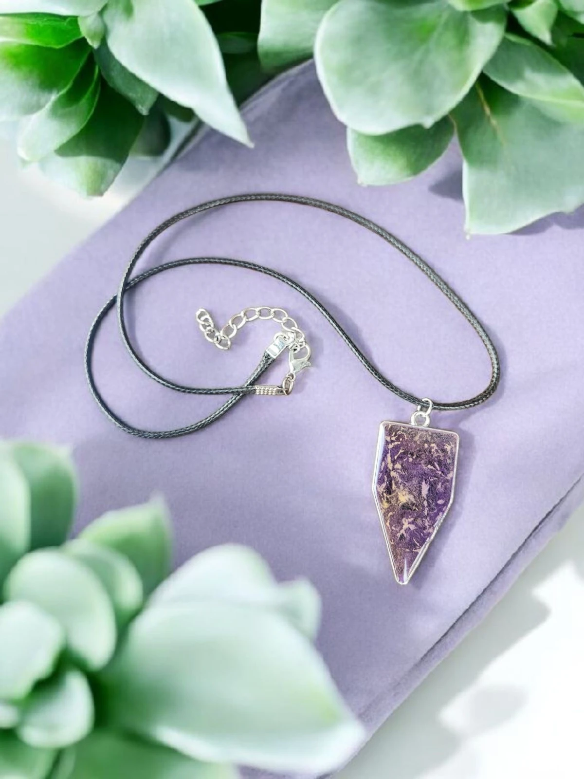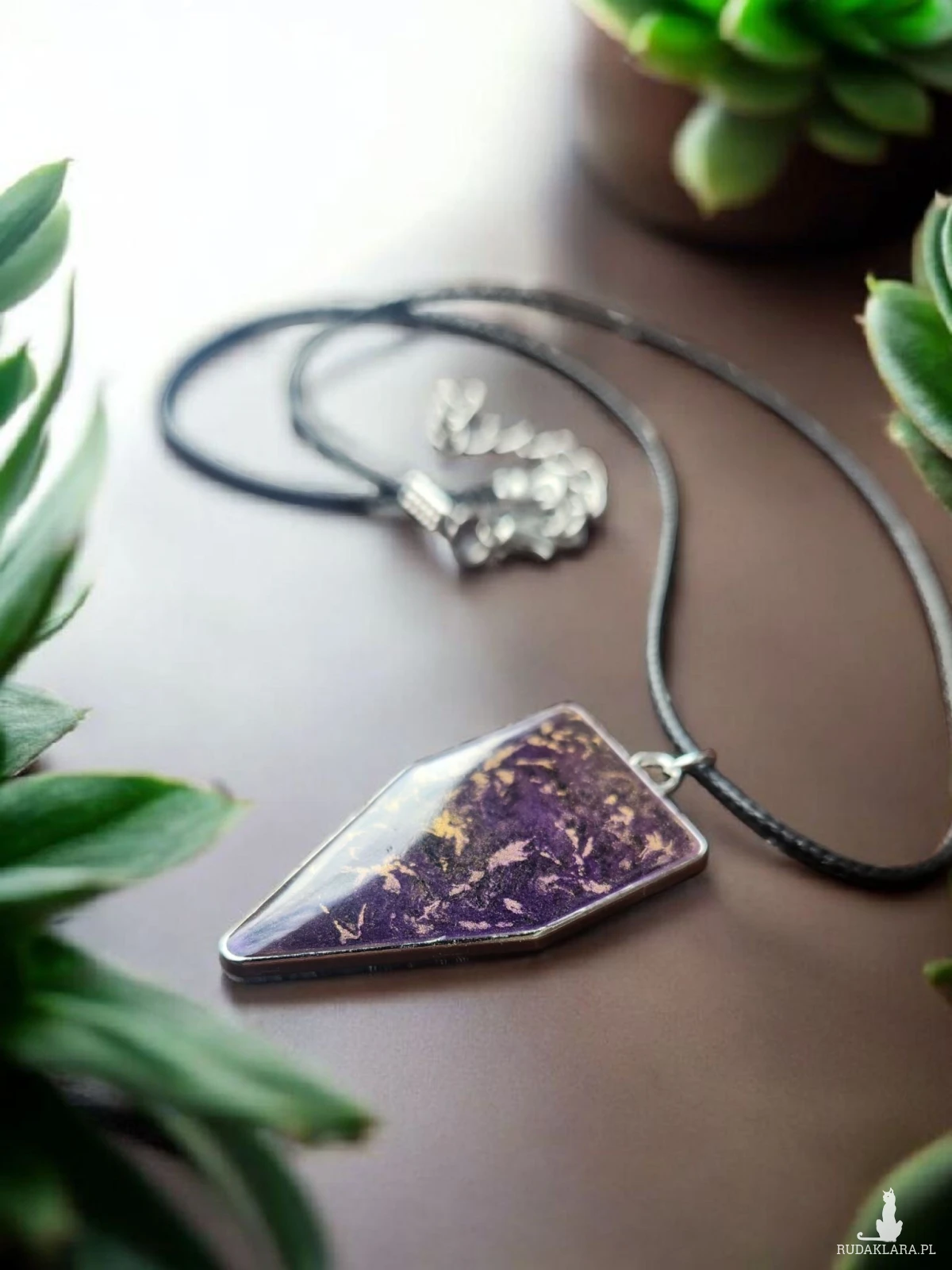 Wyjątkowy naszyjnik z żywicy artystycznej w eleganckim, geometrycznym kształcie to propozycja dla osób ceniących oryginalną biżuterię z charakterem. Ręcznie wykonana zawieszka zachwyca głębokim odcieniem fioletu, w którym zatopione zostały subtelne, złote akcenty tworzące niepowtarzalny, abstrakcyjny wzór. Każdy egzemplarz jest jedyny w swoim rodzaju – układ barw i refleksów nigdy się nie powtarza.