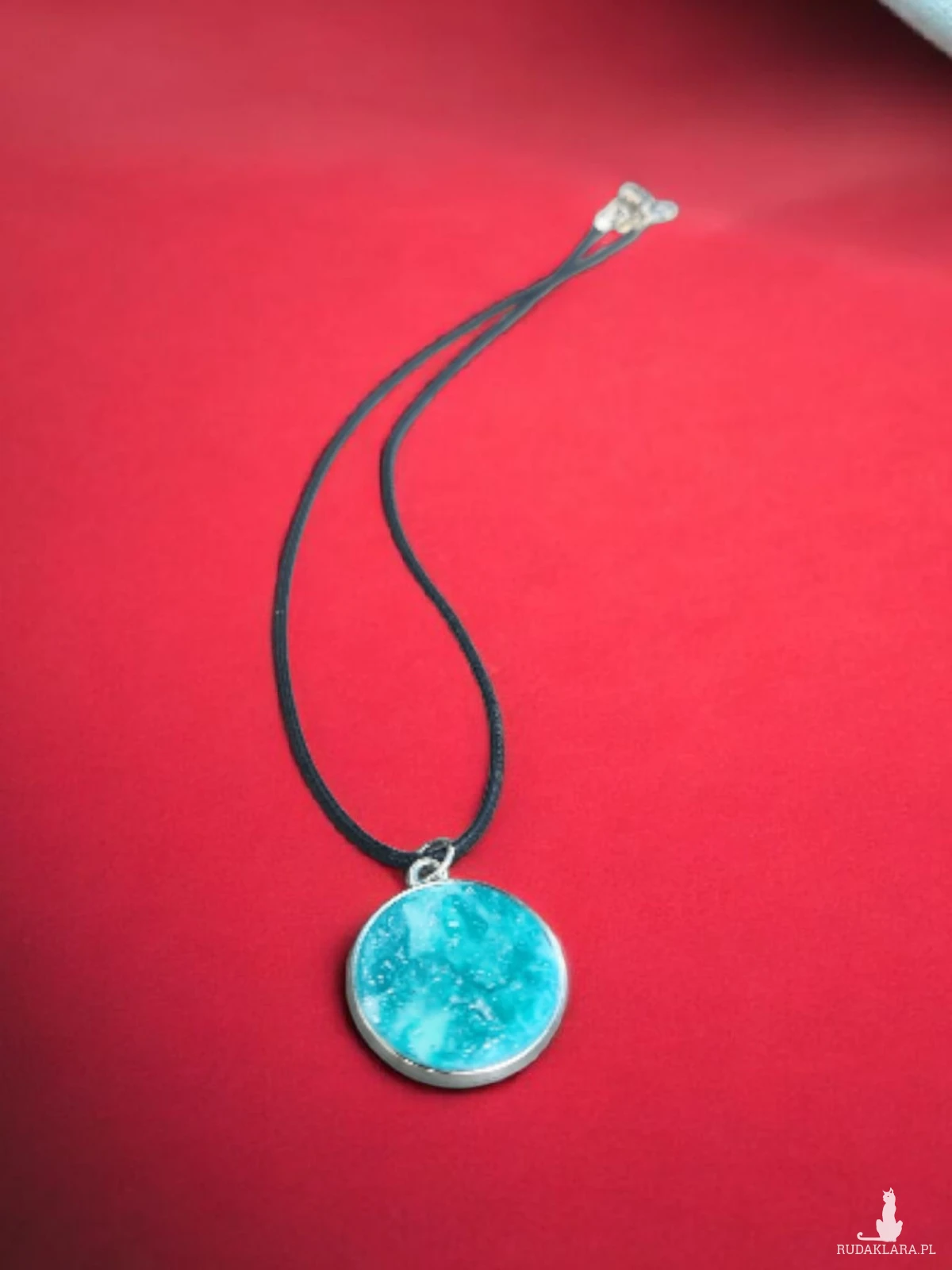 Wisiorek ma średnicę 2,5 cm i jest oprawiony w solidną bazę, zawieszony na czarnym rzemyku o regulowanej długości 44–50 cm. Jest lekki, wygodny w noszeniu i idealny jako prezent dla miłośników unikatowej biżuterii handmade.