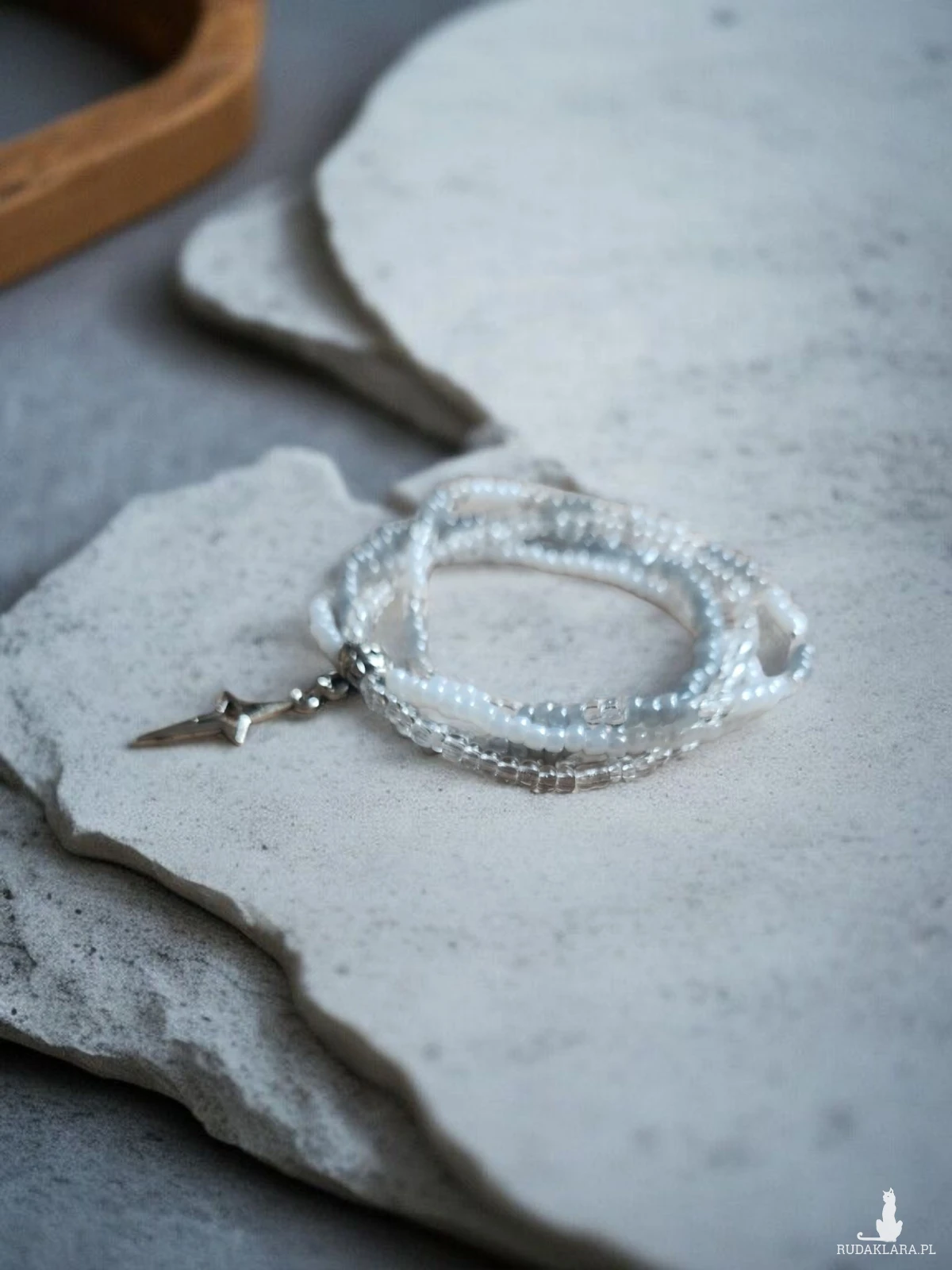 Delikatna, wielowarstwowa bransoletka wykonana ręcznie z mieszanki jasnoniebieskich, mlecznych i przezroczystych koralików. Subtelnie połyskują w świetle, tworząc elegancki i kobiecy efekt. Bransoletkę zdobi srebrzysta zawieszka w kształcie gwiazdy oraz dekoracyjny koralik.