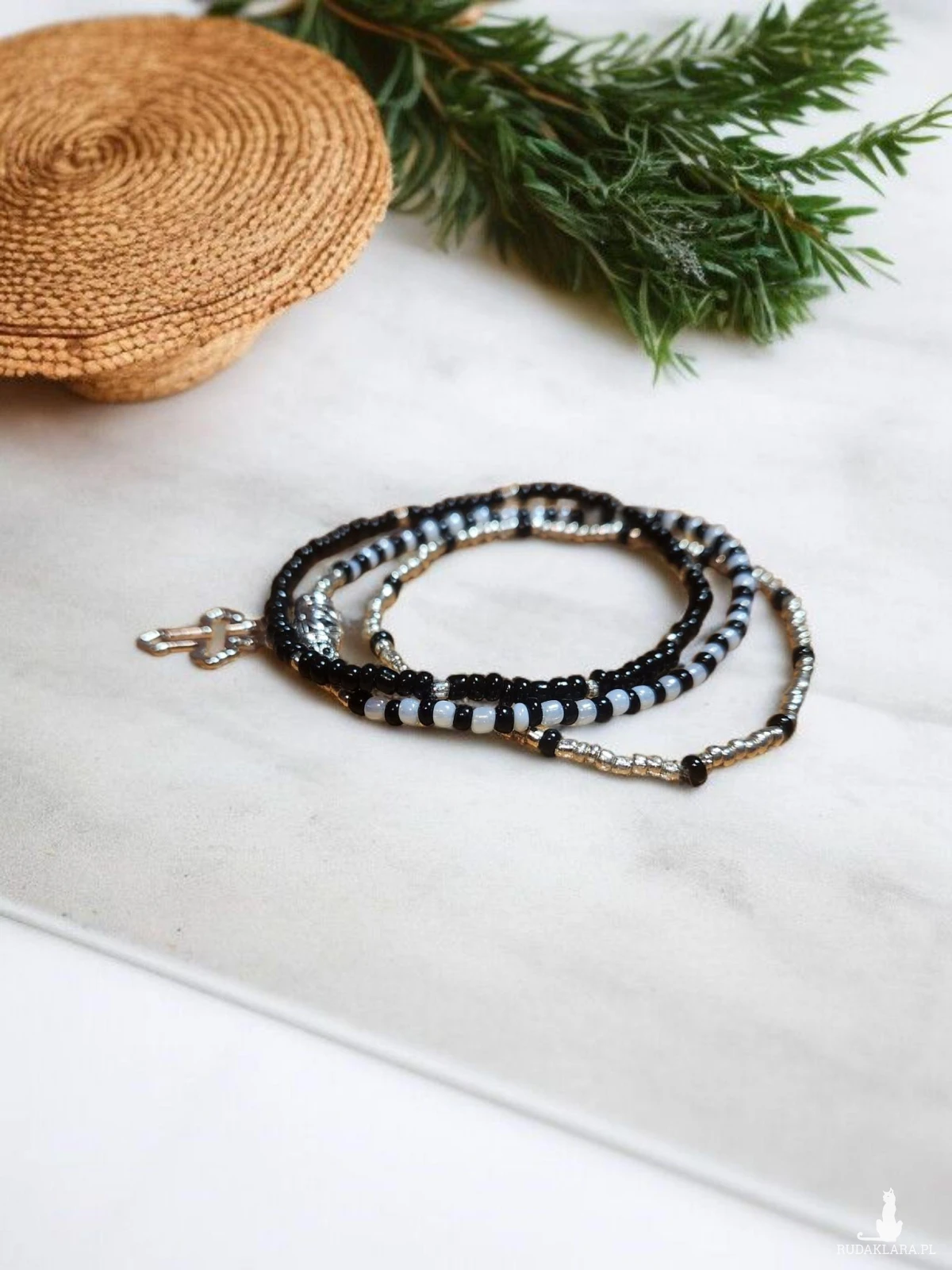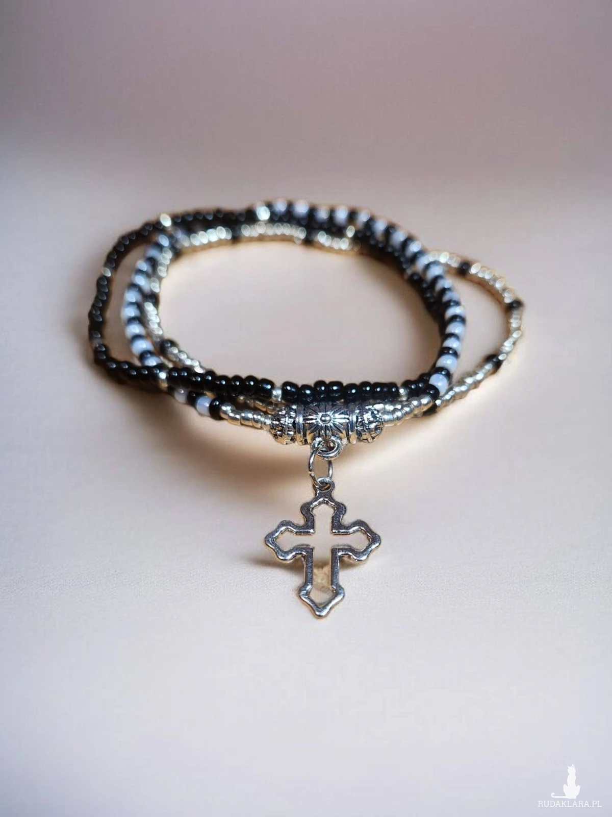 Dodaj odrobinę elegancji i symboliki do swojej codziennej stylizacji dzięki tej ręcznie robionej bransoletce z drobnych koralików. Delikatne czarne, srebrne i jasnoszare koraliki tworzą harmonijną kompozycję, a centralnym punktem jest pięknie zdobiona zawieszka w kształcie krzyża. Bransoletka jest elastyczna, dzięki czemu wygodnie dopasowuje się do nadgarstka.