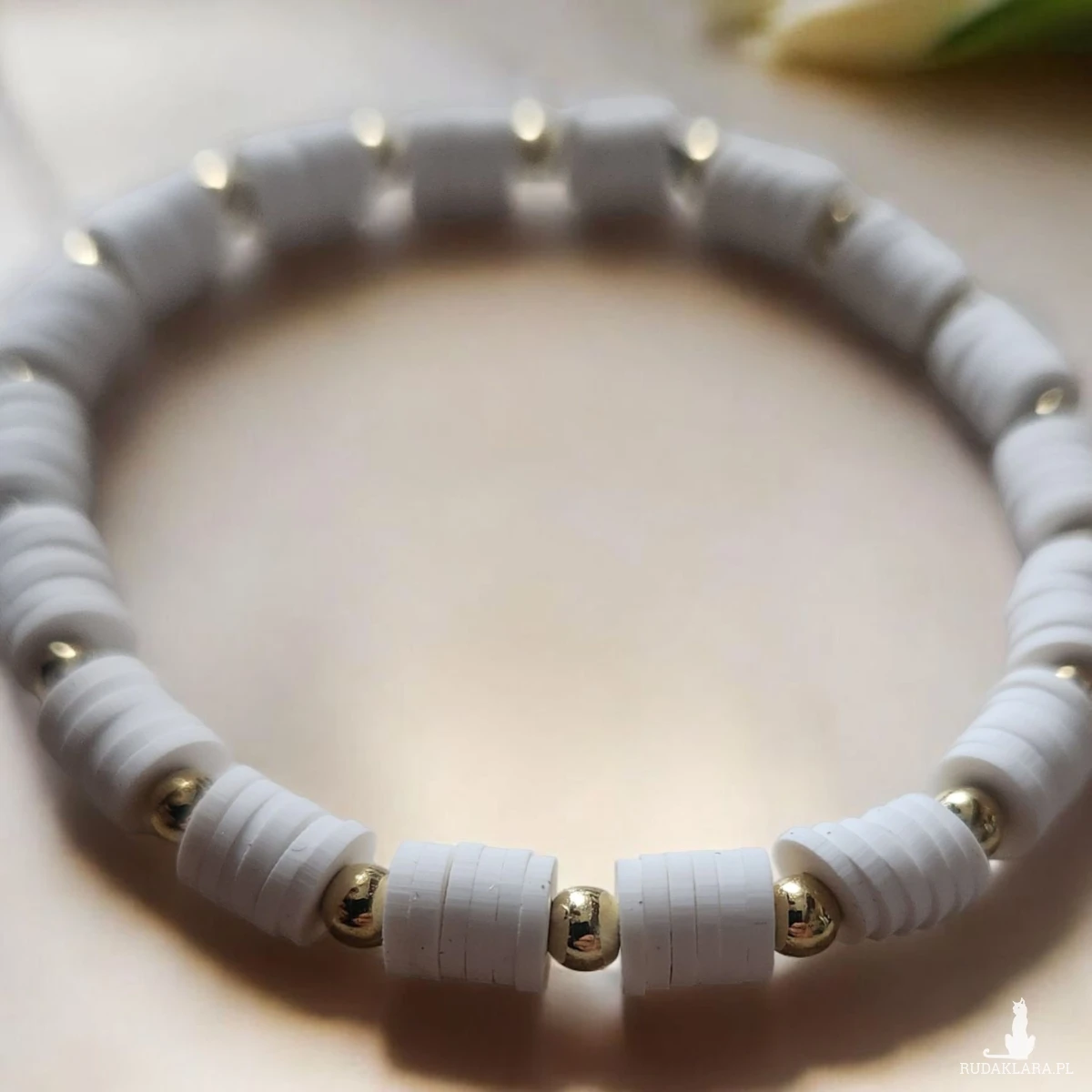Materiały: Wysokiej jakości płaskie koraliki typu Katsuki (glina polimerowa) w kolorze śnieżnobiałym oraz eleganckie, złote przekładki.