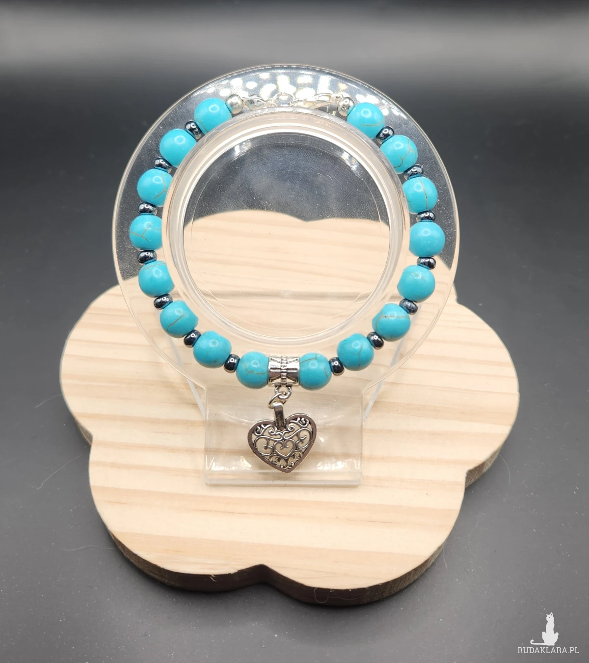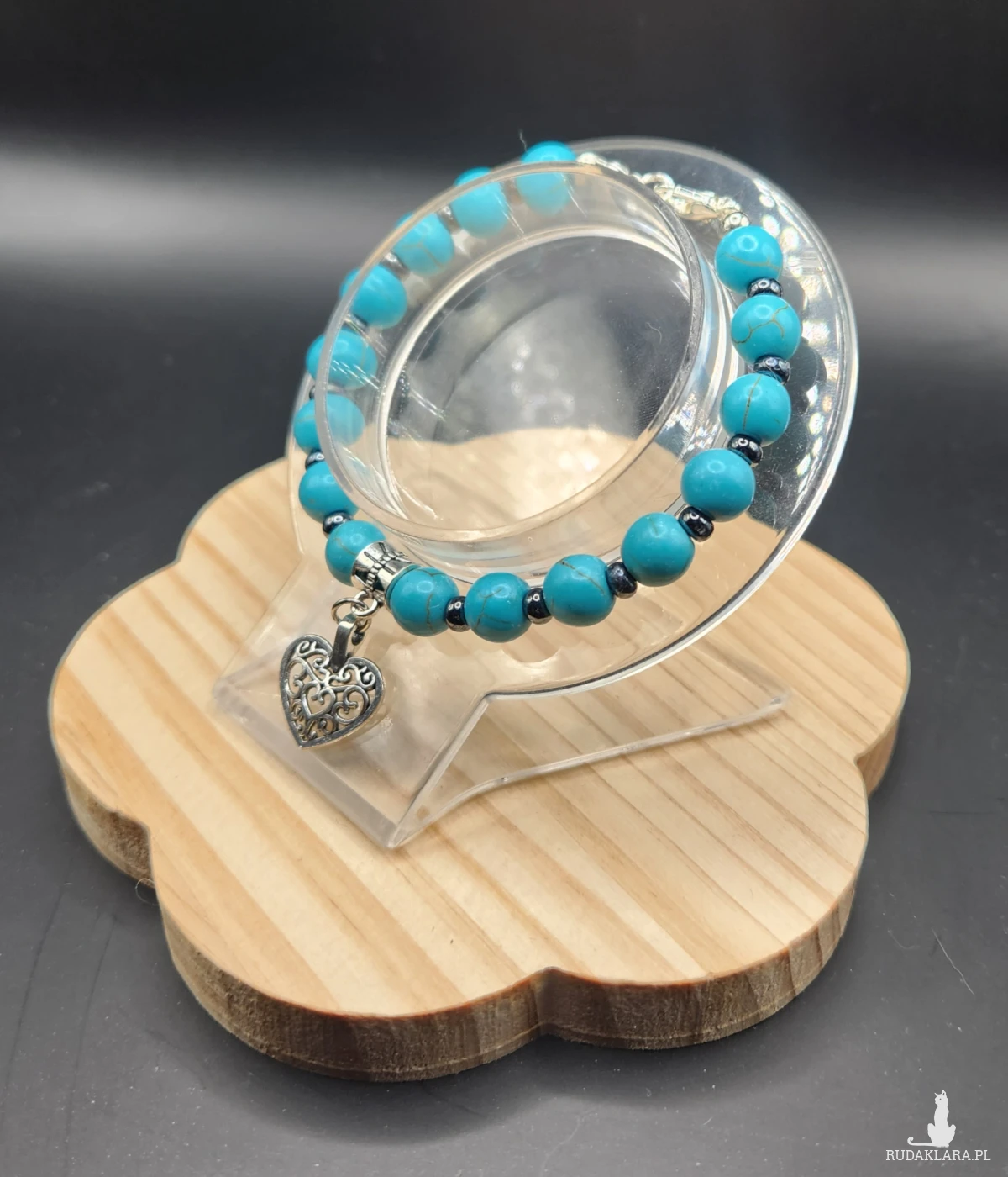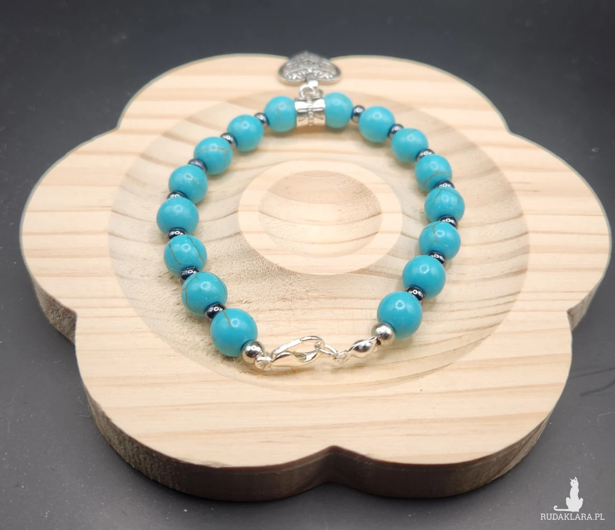 Na sprzedaż oferuję piękną, ręcznie wykonaną bransoletkę z koralików w intensywnym kolorze turkusowym. Bransoletka charakteryzuje się eleganckim połączeniem matowych kamieni z metalowymi elementami ozdobnymi, co nadaje jej wyjątkowego charakteru.