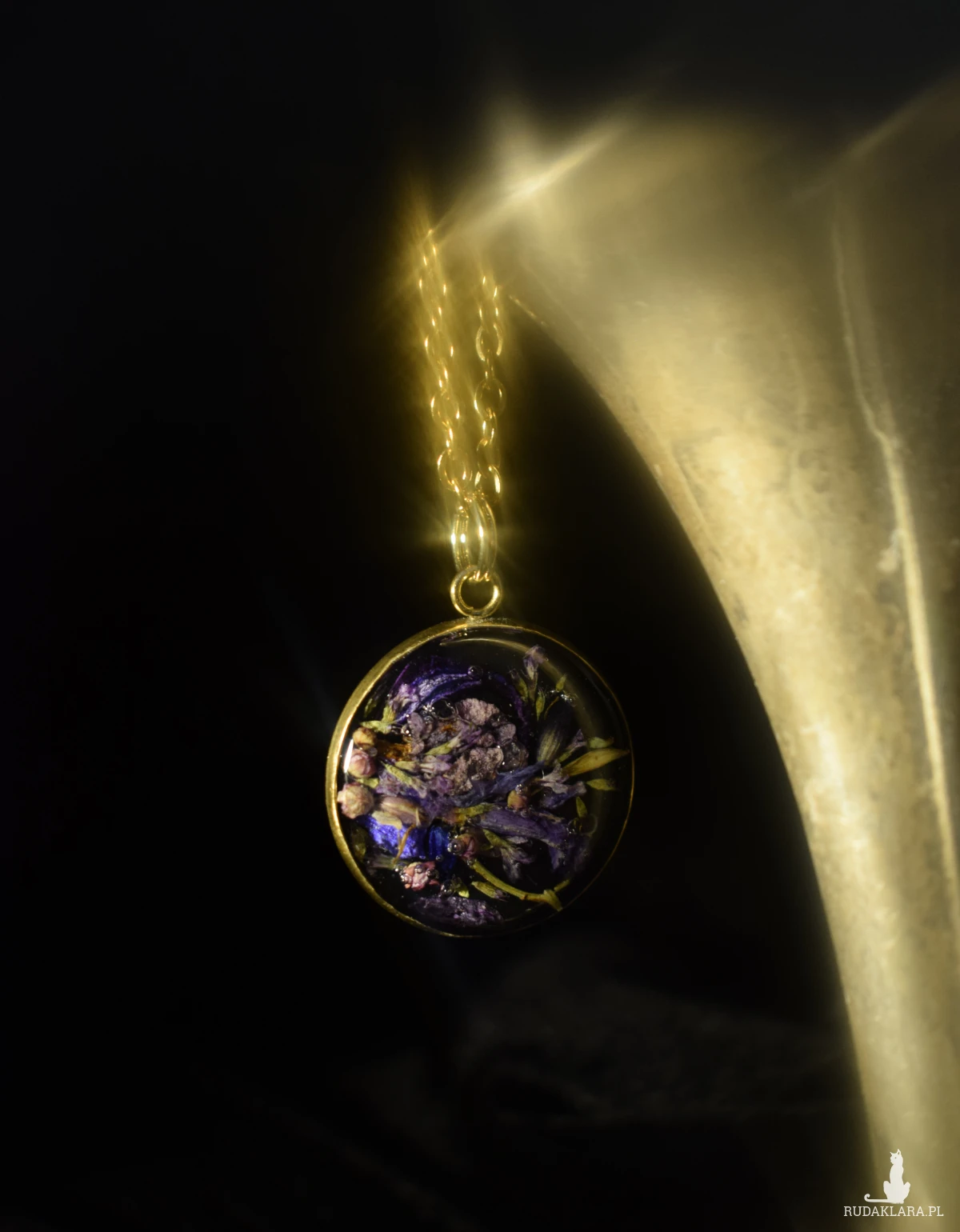 Hej, hej! Mamy tutaj wisior na czarnym tle z zatopionymi w żywicy kwiatami, które własnoręcznie zebrałam: mięty, lawendy, majowego bzu, leśnych dzwonków i pąkami sadźca dętego :) a wszystko na czarnym tle z dodatkiem złotej oprawy.