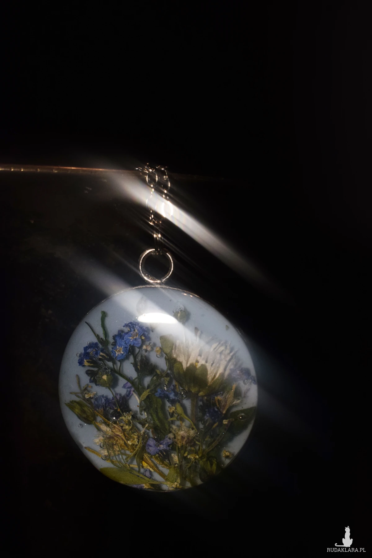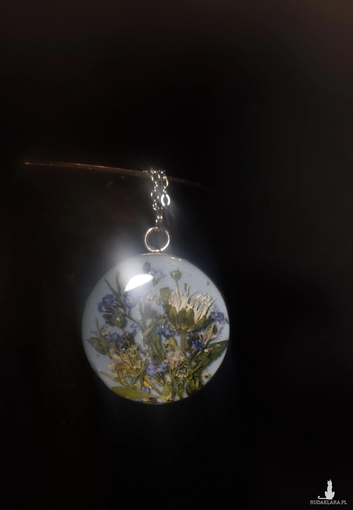 Hej, hej! Mamy tutaj wisior na błękitnym tle z zatopionymi w żywicy kwiatami, które własnoręcznie zebrałam - niezapominajki, stokrotka i polne trawki. Jest to u mnie totalny unikat, ponieważ na co dzień , nie wykonuję naszyjników z takim bazowym tłem.