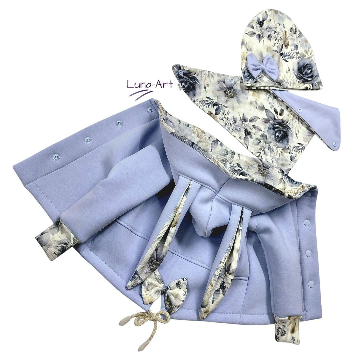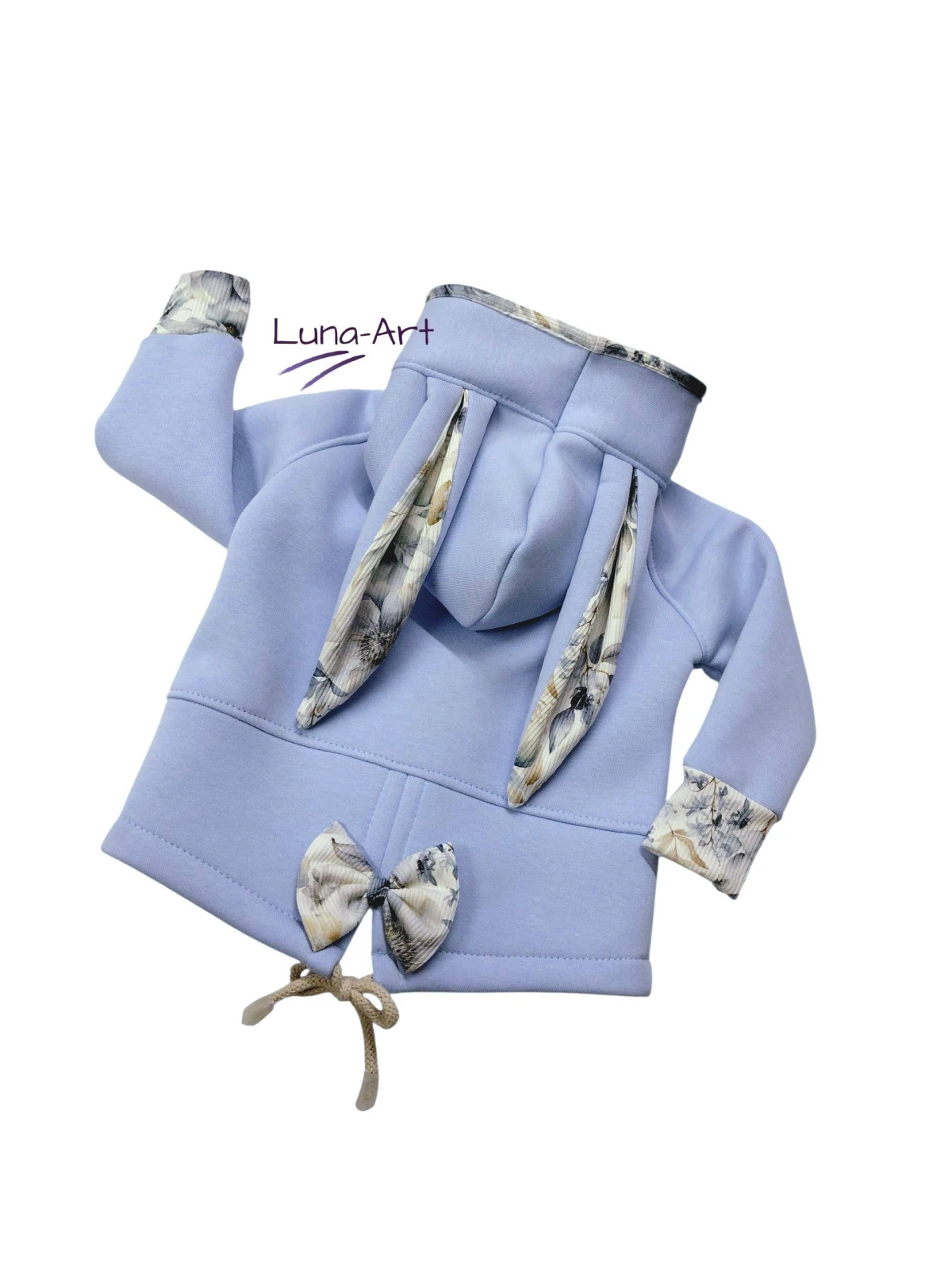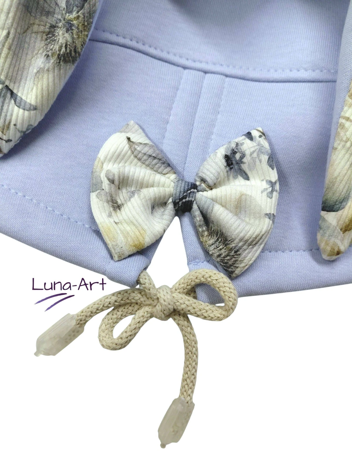 W kapturze, uszach, na końcówkach rękawów oraz ozdobne kokardki to dzianina prążkowana w kwiatki wzór cyfrowy. Z tyłu ozdobny, bawełniany sznurek.