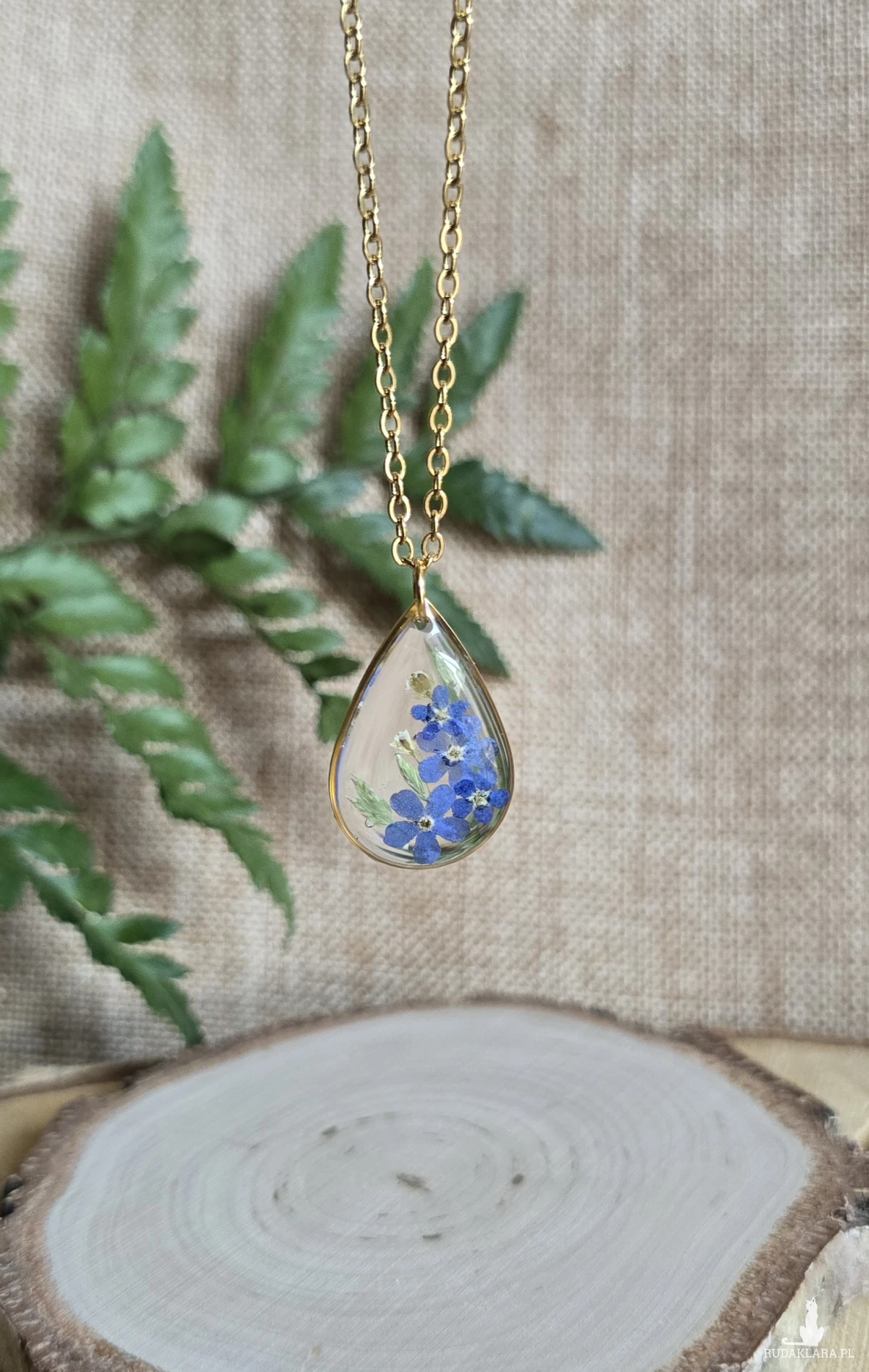 Złota zawieszka złoty wisiorek kwiat naszyjnik żywica z żywicy kwiaty łezka łza niezapominajki