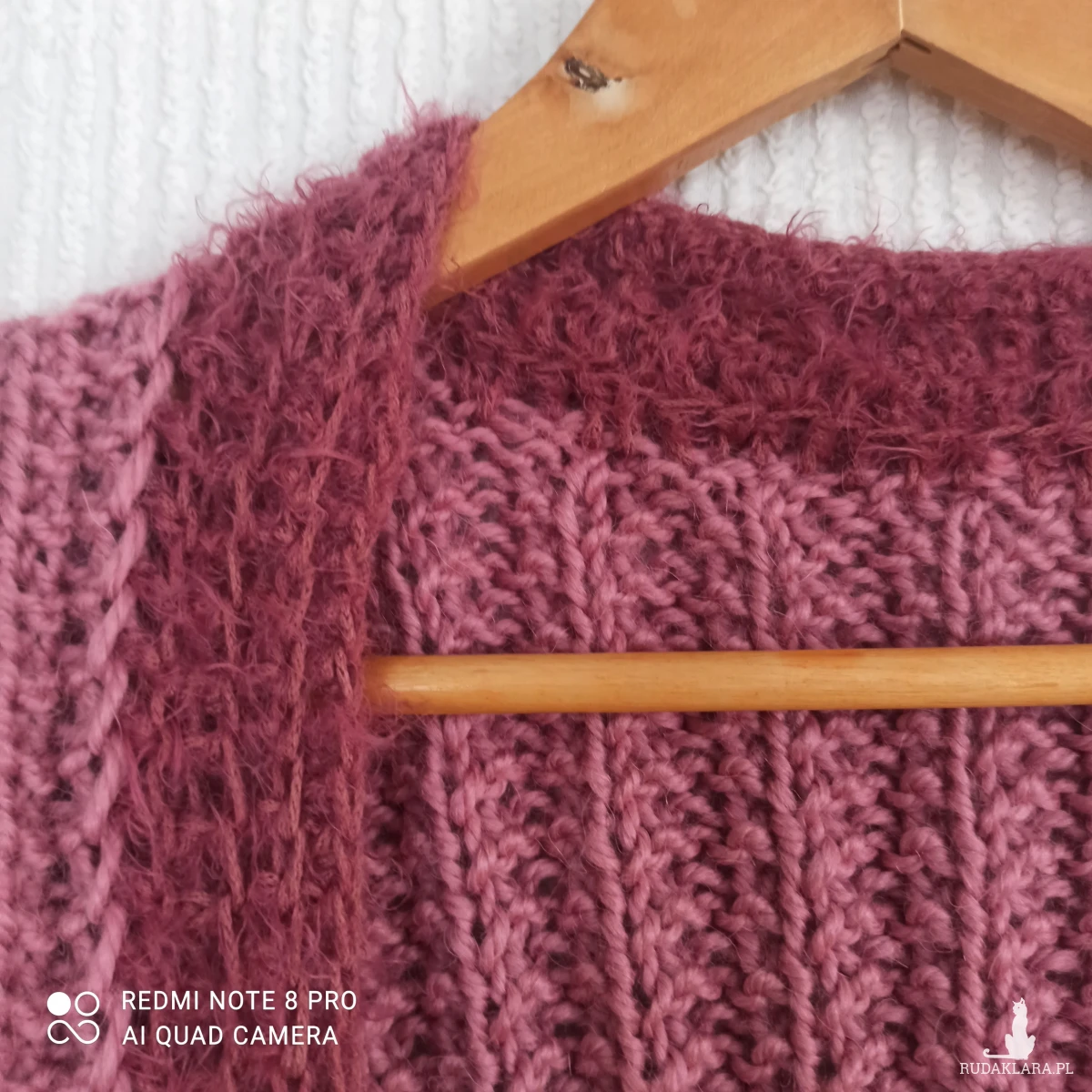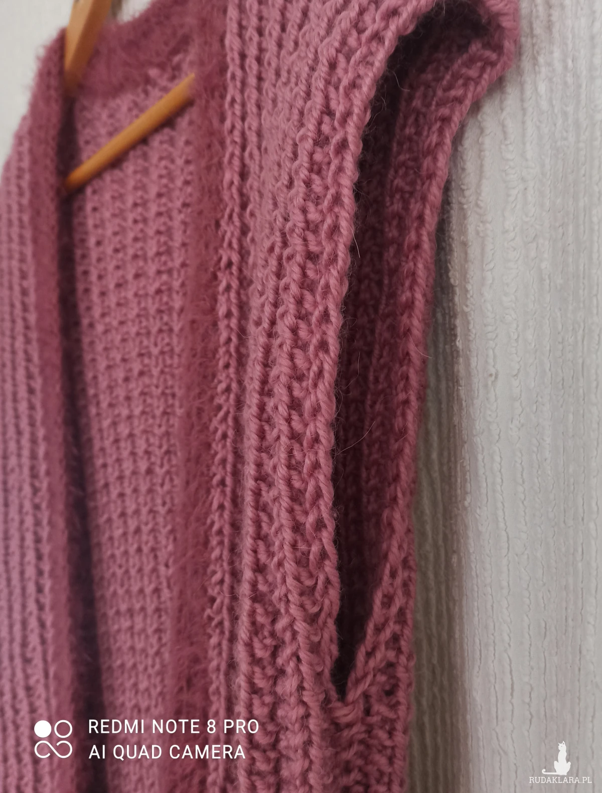 Gruba kamizelka bez guzików z grubej sprężystej wełny w kolorze liliowym/nasyconym różowym/. Wykonana ręcznie na drutach ciekawym wzorem/pończoszniczym/. Wykończona na szydełku moherową pliską. Dzięki zastosowanemu splotowi kamizelka może być noszona przez szczupłe jak i osoby większego rozmiaru. Ramiona szerokie lekko opadające. W całości bardzo elegancko wygląda. Jest miła w dotyku. Nić 100% wełna. Bardzo ciepła.