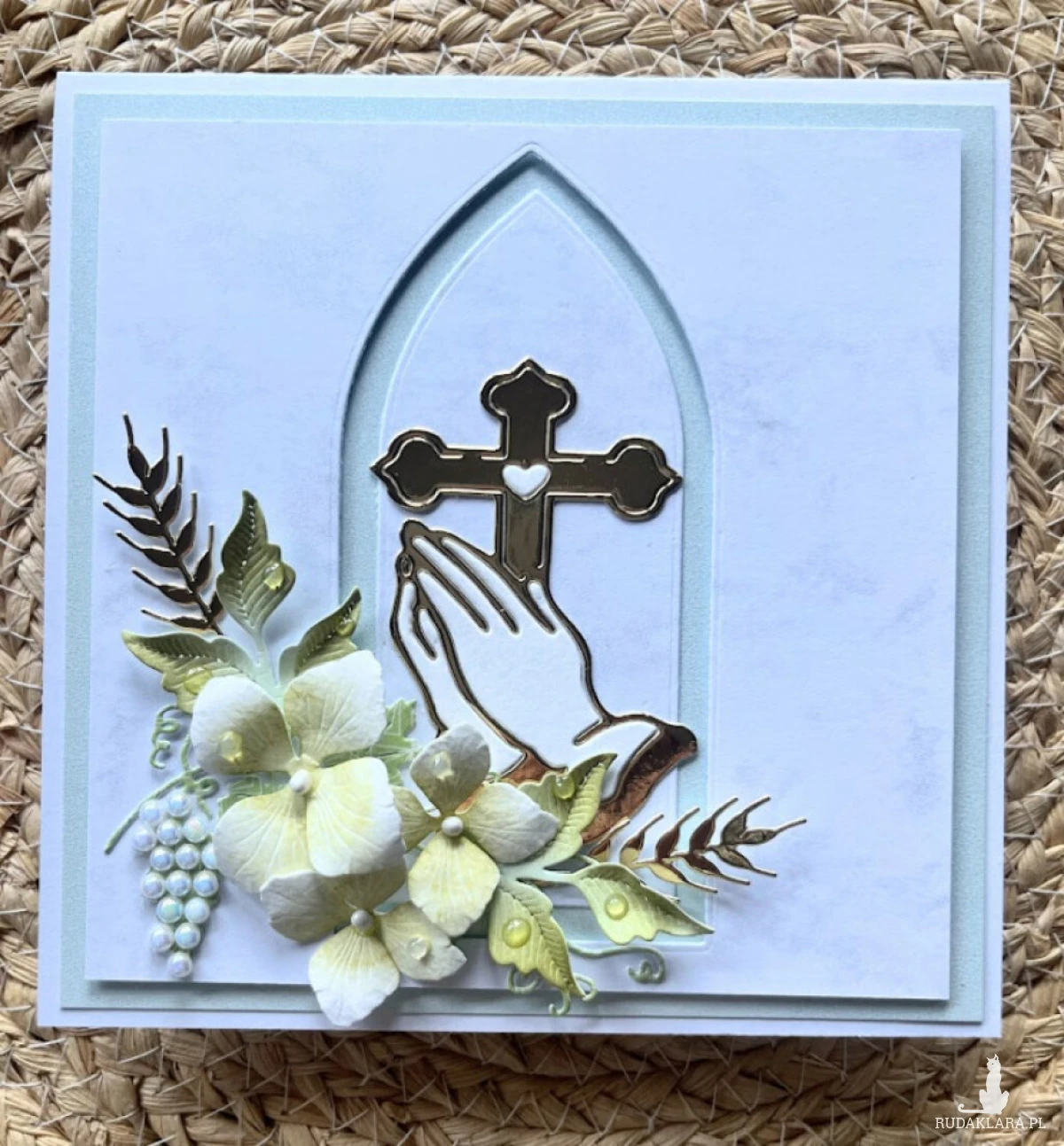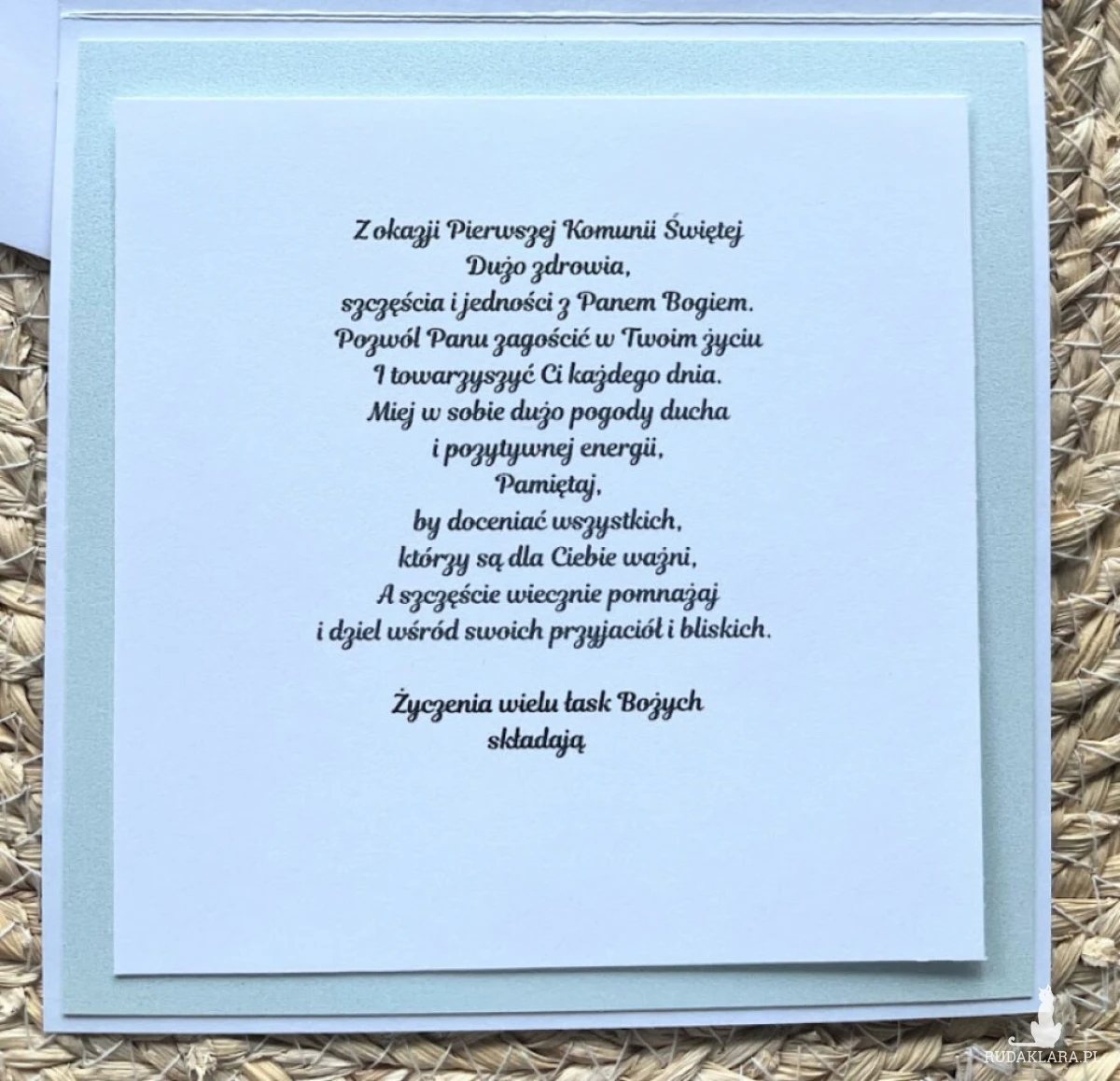 Kartka ręcznie robiona na Komunię Świętą dla chłopca, w kolorystyce perłowego błękitu,złota i bieli.. Wewnątrz kartki gotowe życzenia do własnoręcznego podpisu oraz miejsce z kieszonką na małe co nieco. Wielkość kartki 14,5x14,5 . koperty 15,5x15,5 Do kompletu dodano torebkę stworzono w tej samej stylizacji. Wielkość torebki 22,5x18x8 cm.W tej postaci kartka do natychmiastowej wysyłki,