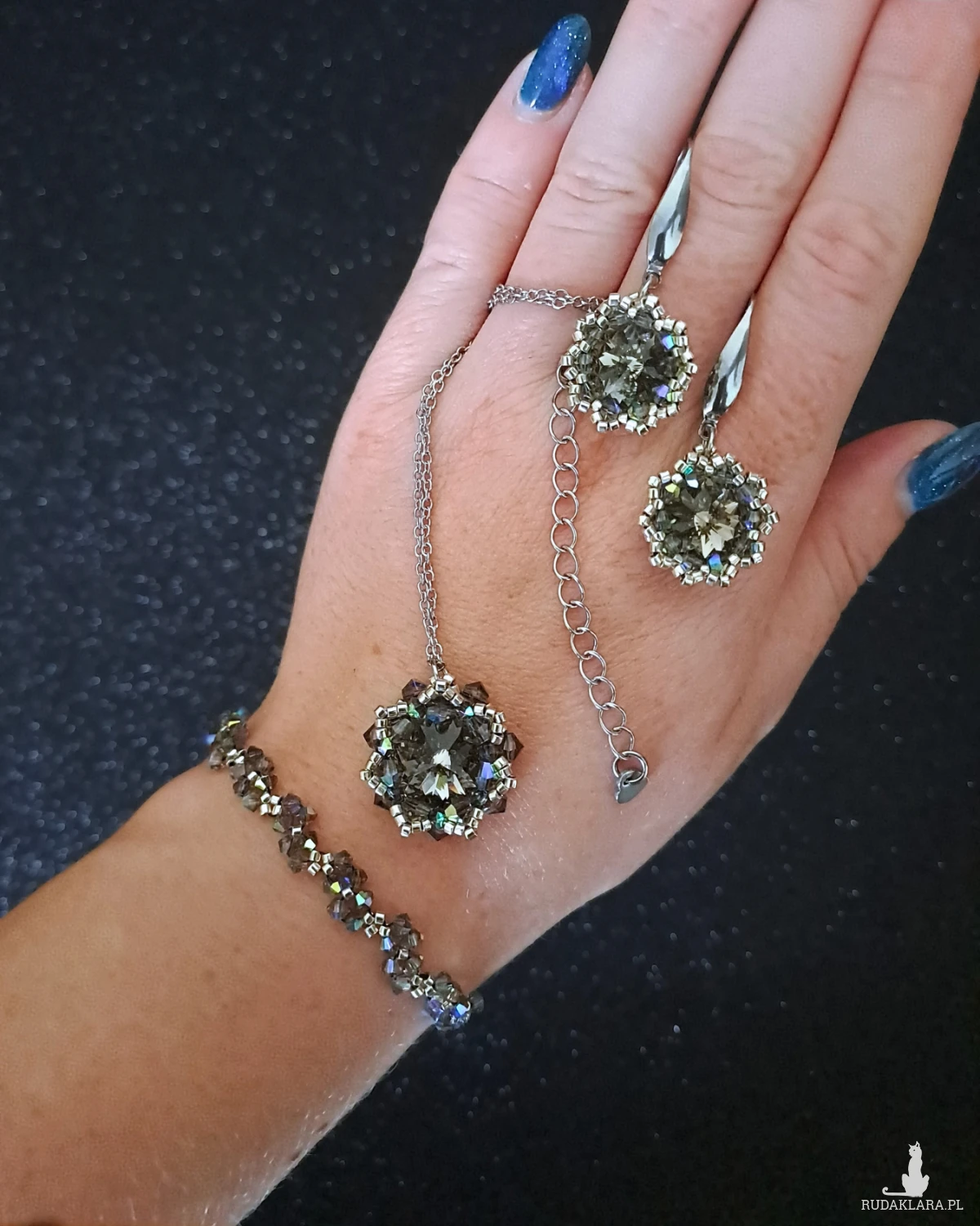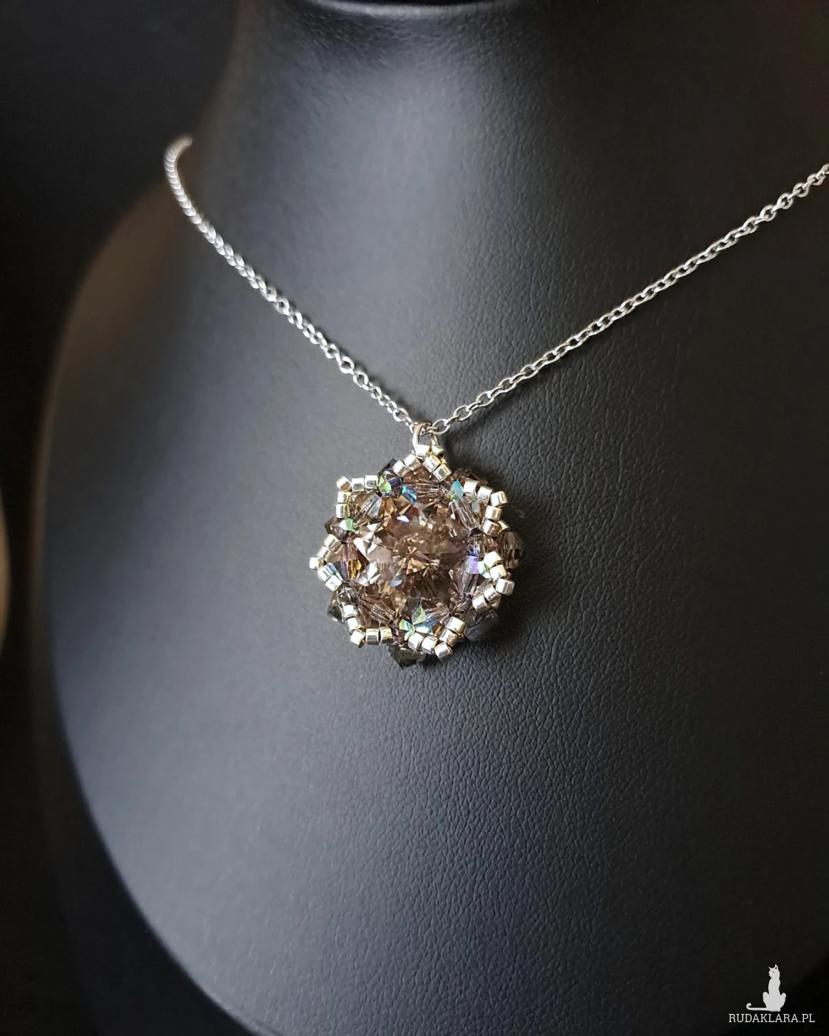 - Naszyjnik: zawieszka z kryształem Preciosa Rivolil Maxima 14 mm w kolorze Black Diamond, oprawiona w srebrne Miyuki i kryształki Bicone. Wymiary zawieszki: 2,7 × 2,5 cm. Łańcuszek stalowy typu ankier 45 cm (plus 5 cm przedłużka).