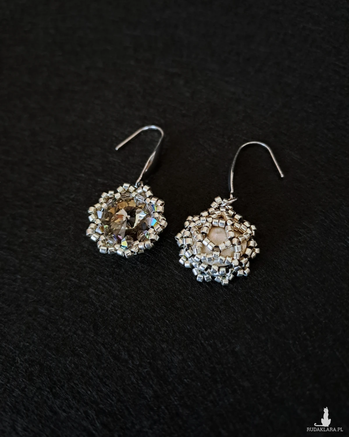 - Kolczyki: centralny kryształ Preciosa Rivoli Maxima 12 mm w odcieniu Black Diamond, otoczony kryształkami Preciosa Bicone i srebrnymi koralikami Miyuki. Długość ok 4 cm.