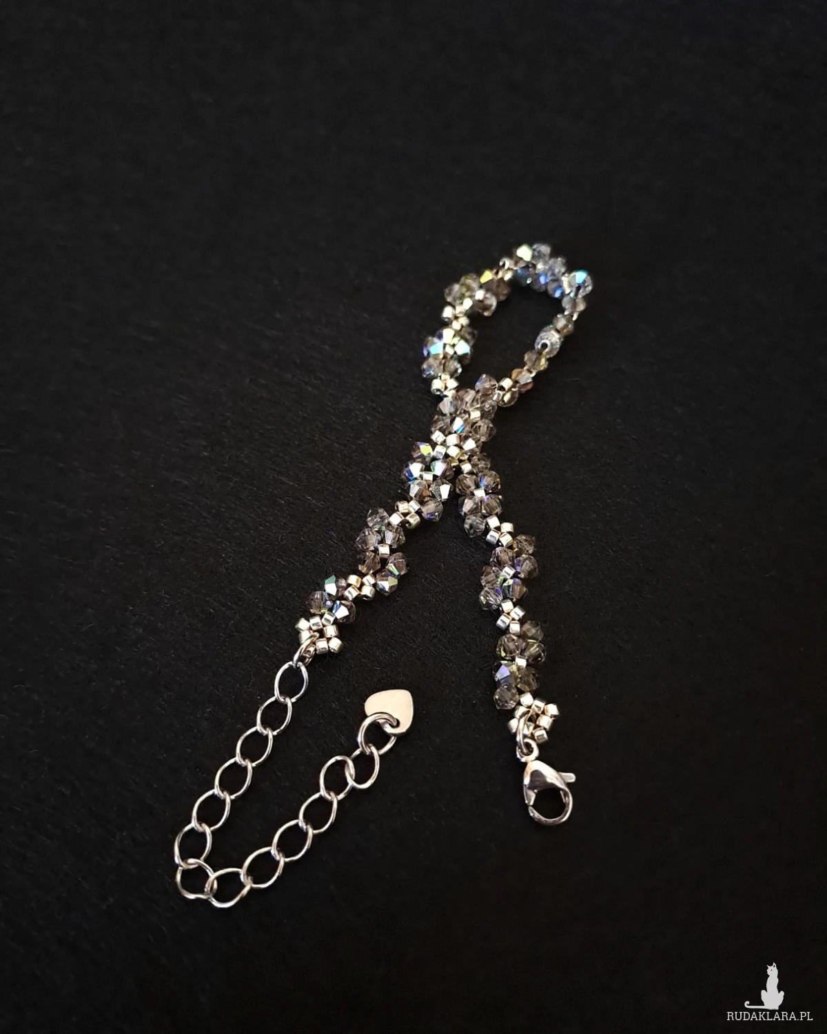 - Bransoletka: splot drobnych kryształków Preciosa Black Diamond 3 mm i srebrnych Miyuki Delica, szer. 0,7 cm.