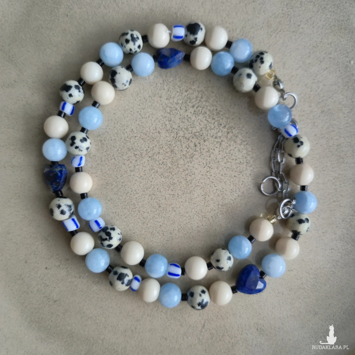 MATERIAŁ: jaspis dalmatyński, kamień rzeczny, agat, lapis lazuli, koraliki szklane, żyłka jubilerska