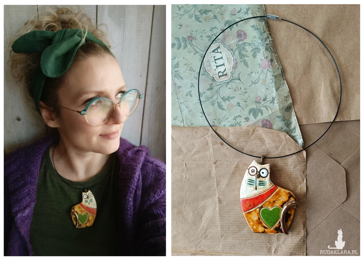 Naszyjnik ceramiczny z motywem kota o wymiarach ok 6 cm x 7 cm na drucianej kolii. Polecam serdecznie wszystkim miłośniczkom nietuzinkowej biżuterii.