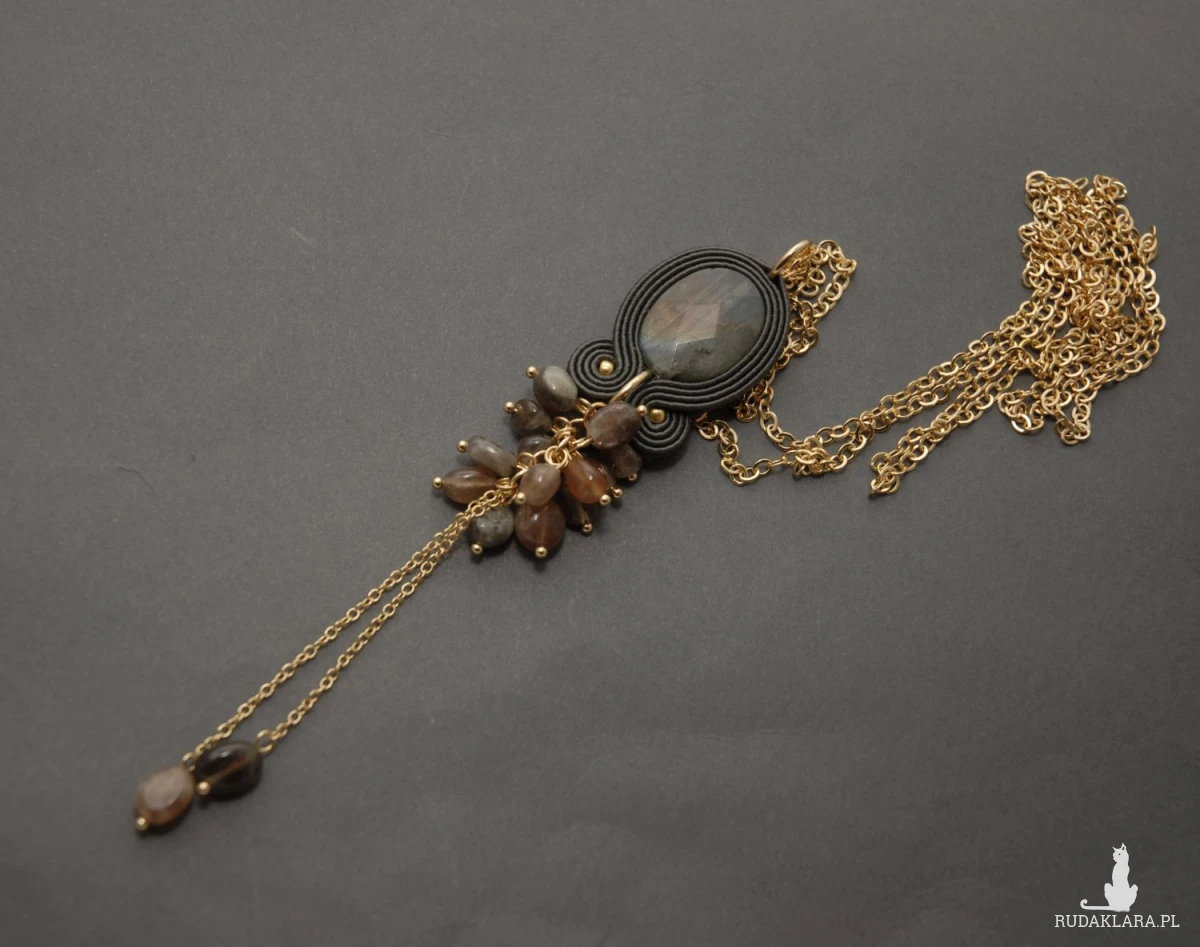 Oferuję wisiorek sutasz ozdobiony fasetowanym dużym labradorytem i agatami zamontowanymi na łańcuszkach