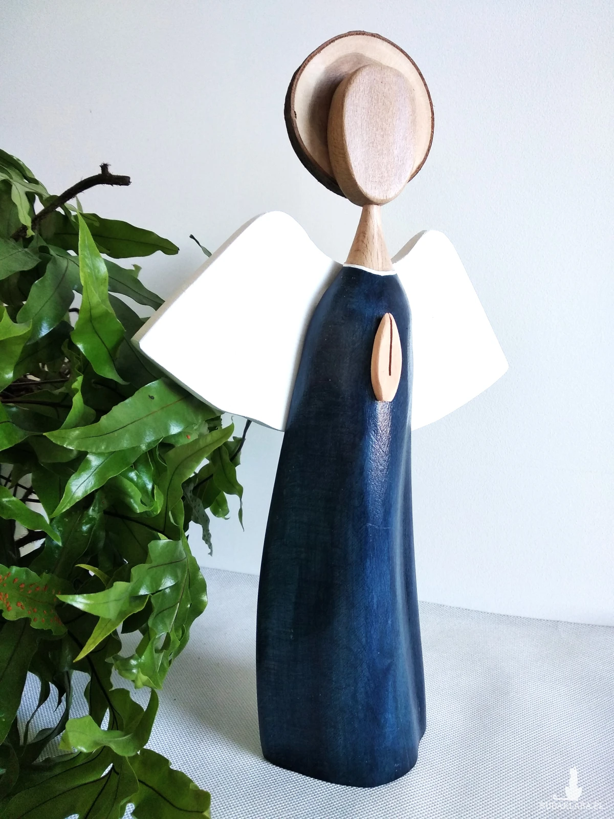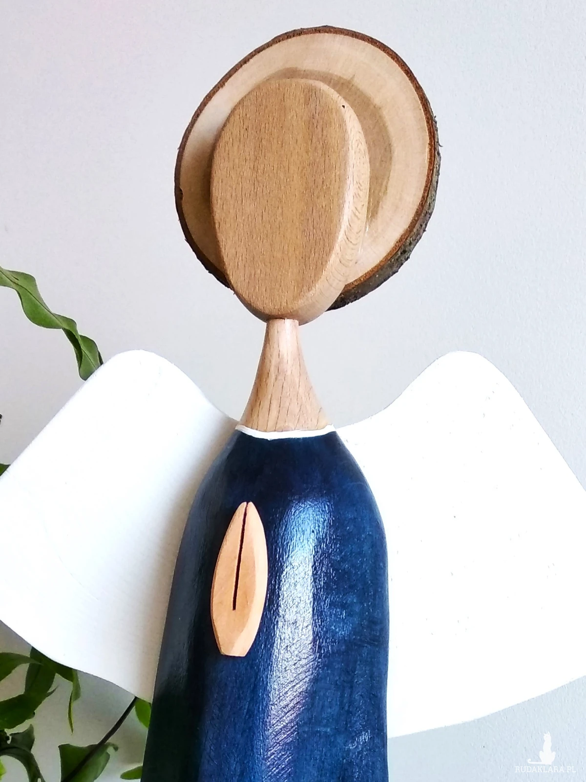 Autorski anioł wykonany ręcznie z różnego rodzaju naturalnego drewna, barwionego bejcą wodną, malowanego akrylową farbą lub pozostawionego w swojej naturalnej barwie. Każdy egzemplarz tworzę samodzielnie – nie jest to produkt masowy.