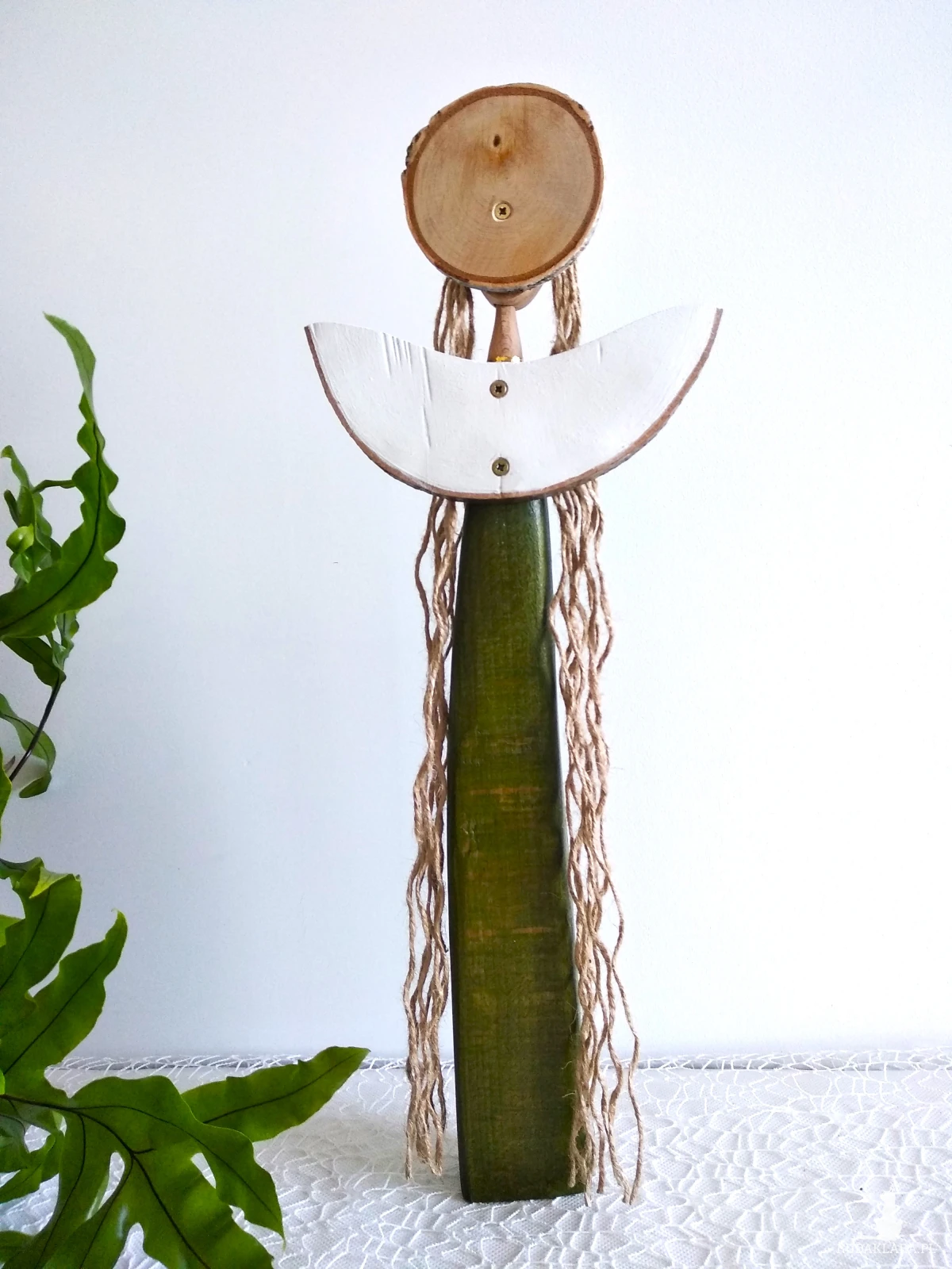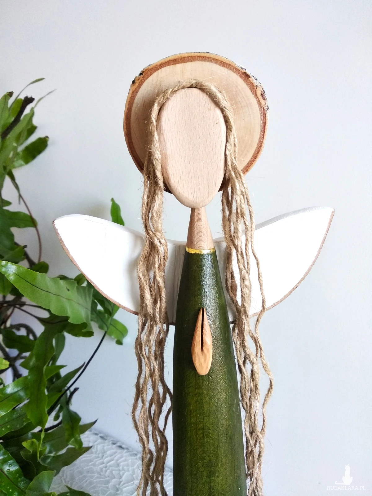 Autorski anioł wykonany ręcznie z rożnych gatunków naturalnego drewna,barwionego bejcą wodną, malowanego akrylową farbą lub pozostawionego w swojej naturalnej barwie.