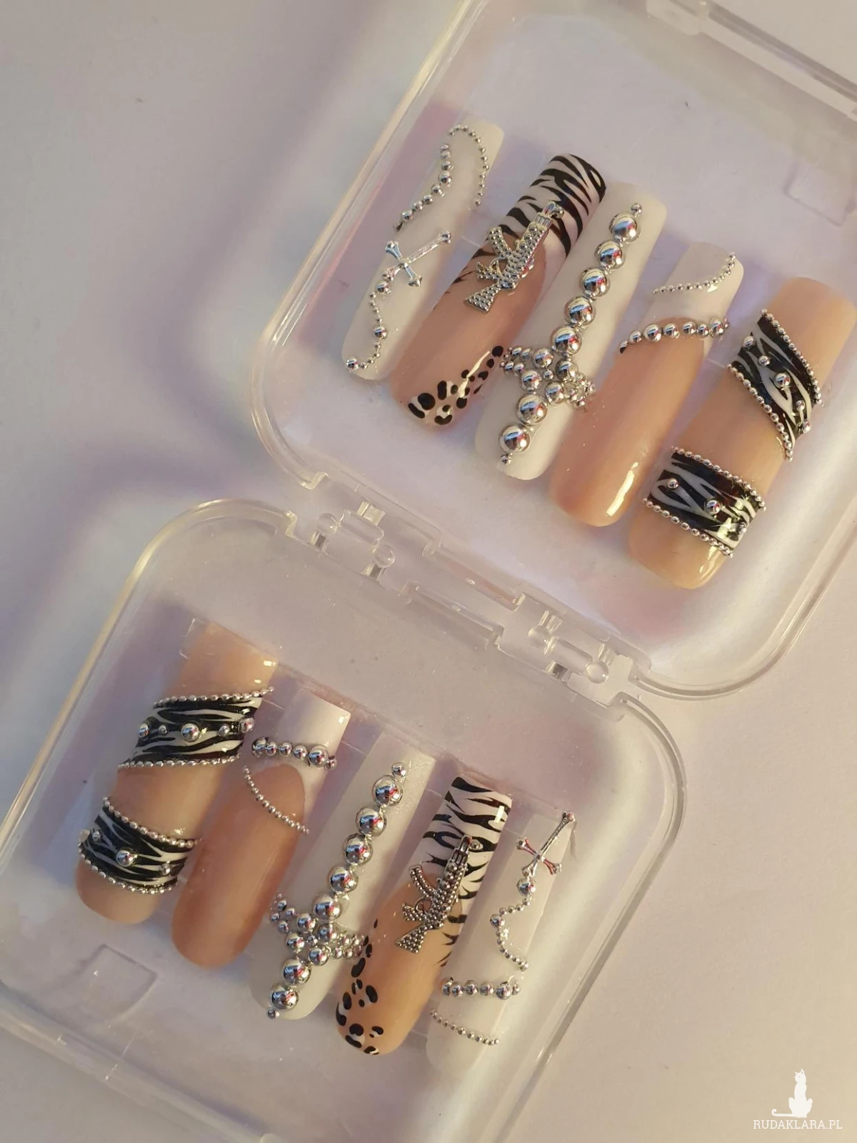 Ostrzeżenia i informacje dotyczące bezpieczeństwa produktu: Produkt przeznaczony do użytku kosmetycznego. Tipsy są wykonywane ręcznie, dlatego poszczególne egzemplarze mogą się nieznacznie różnić. Produkt może wywołać reakcję alergiczną u osób wrażliwych na materiały użyte do stylizacji paznokci (np. klej, żel). Nie stosować na uszkodzoną lub chorą płytkę paznokcia. Produkt nie jest przeznaczony dla dzieci. Przechowywać w suchym miejscu, z dala od małych dzieci. Stosować zgodnie z przeznaczeniem – jako sztuczne paznokcie mocowane przy użyciu odpowiedniego kleju lub taśm do tipsów.