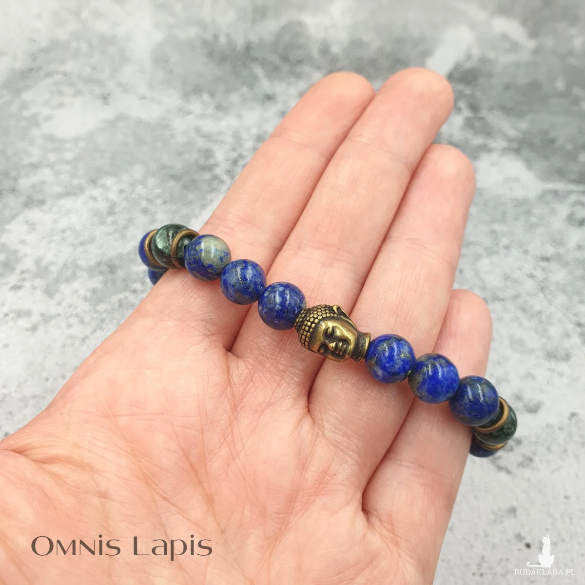 Ozdobiona zawieszką z motywem śpiącego Buddy - symbolem spokoju i harmonii. Buddzie towarzyszą koraliki z lapis lazuli, onyksu oraz serafinitu, rzadkiego minerału, z refleksami przypominającymi skrzydła anioła.