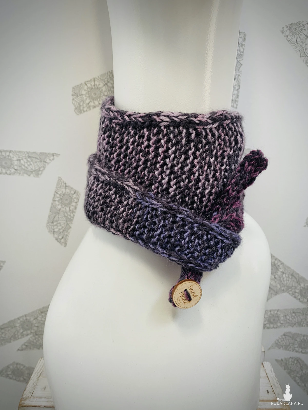 Ręcznie robiony na drutach dzianinowy szalik o krótkiej, wiązanej formie.