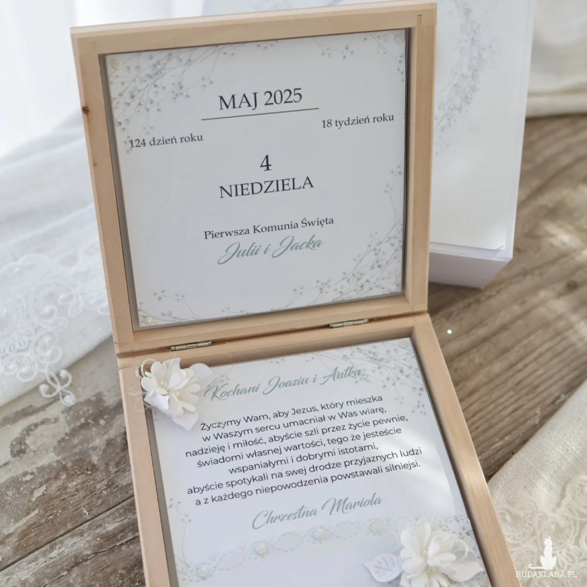 W środku znajdują się życzenia oraz subtelne dekoracje kwiatowe. Możesz wybrać kartkę z kalendarza z datą uroczystości lub zdjęcie dziecka. Dodatkowo istnieje możliwość dodania kieszonki na pieniądze.
