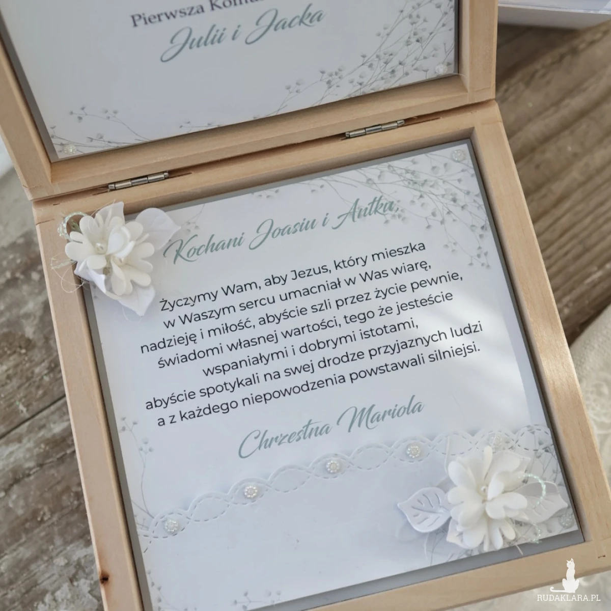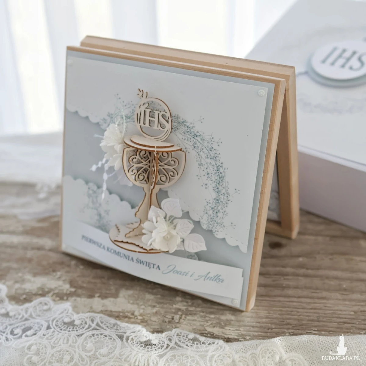 Wyjątkowa pamiątka Pierwszej Komunii Świętej w drewnianym pudełku to elegancki prezent, który pozostanie piękną pamiątką na lata. Kartka ozdobiona jest z przodu dekoracyjnym kielichem 3D oraz delikatną kompozycją kwiatową.