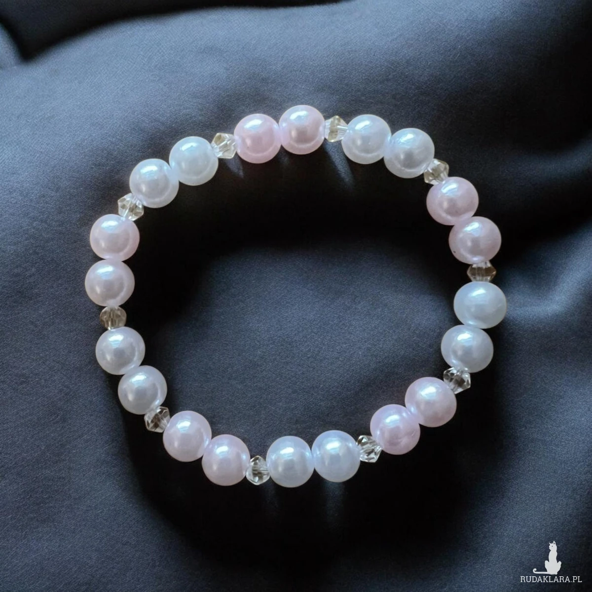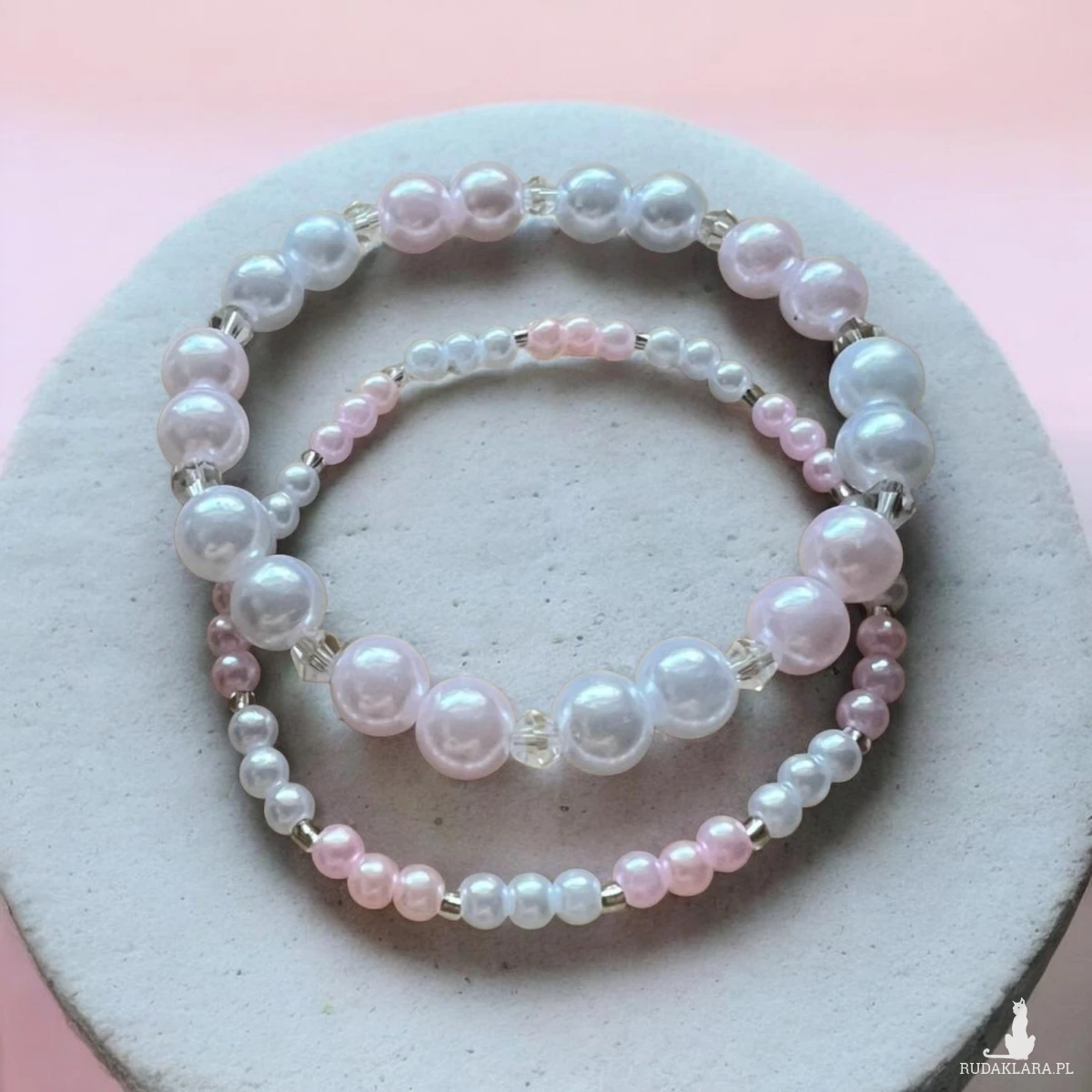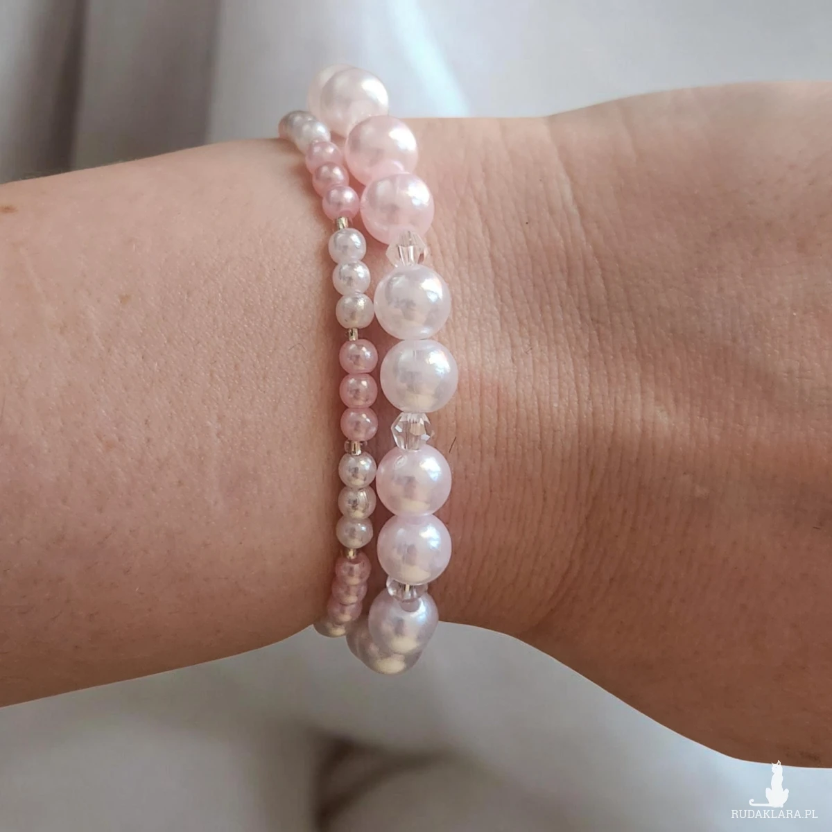 Piękna, subtelna bransoletka wykonana z perełek w odcieniach bieli i pastelowego różu. Składa się z trzech cienkich rzędów koralików o różnej wielkości, które razem tworzą bardzo elegancki i kobiecy efekt.