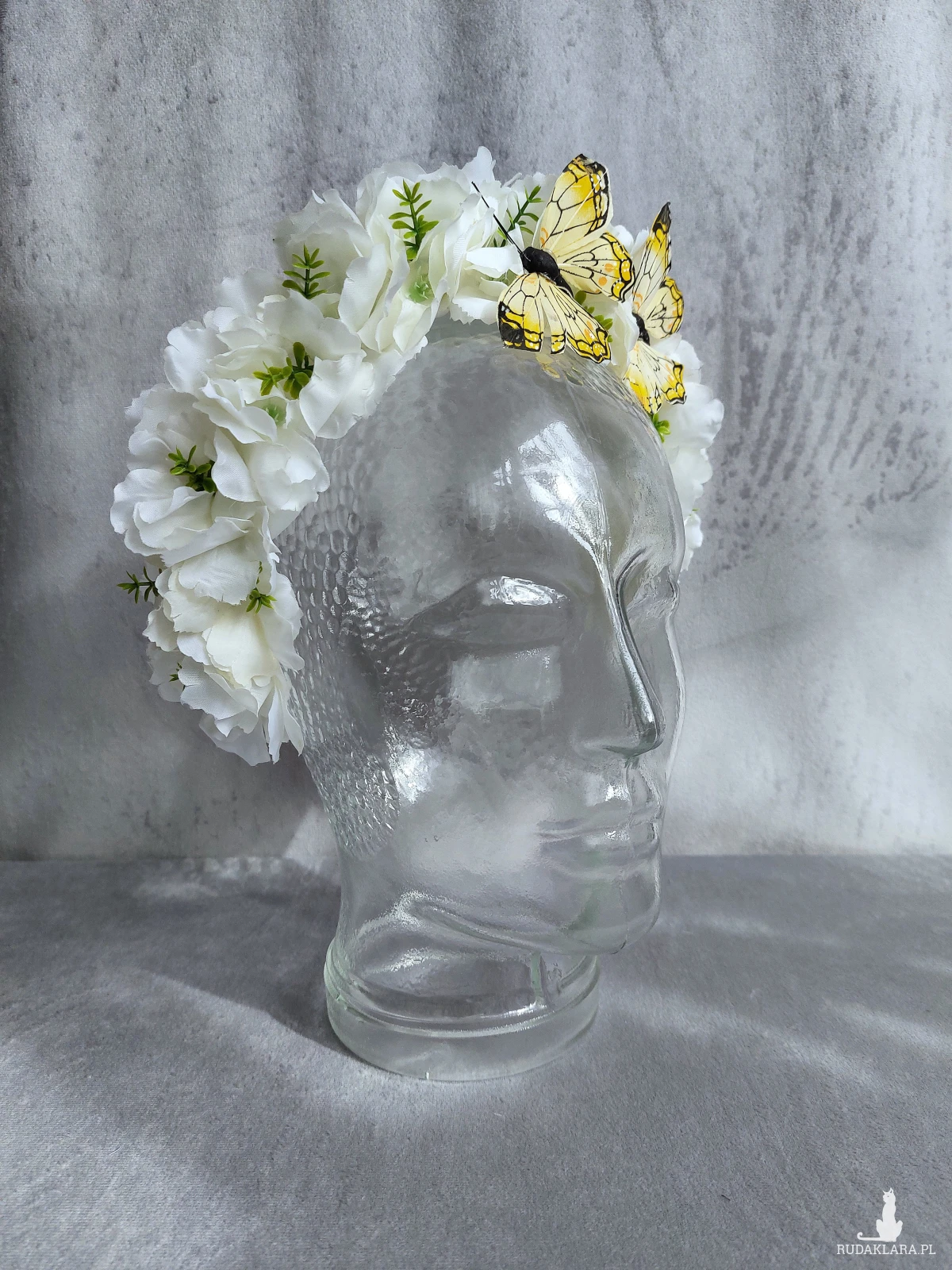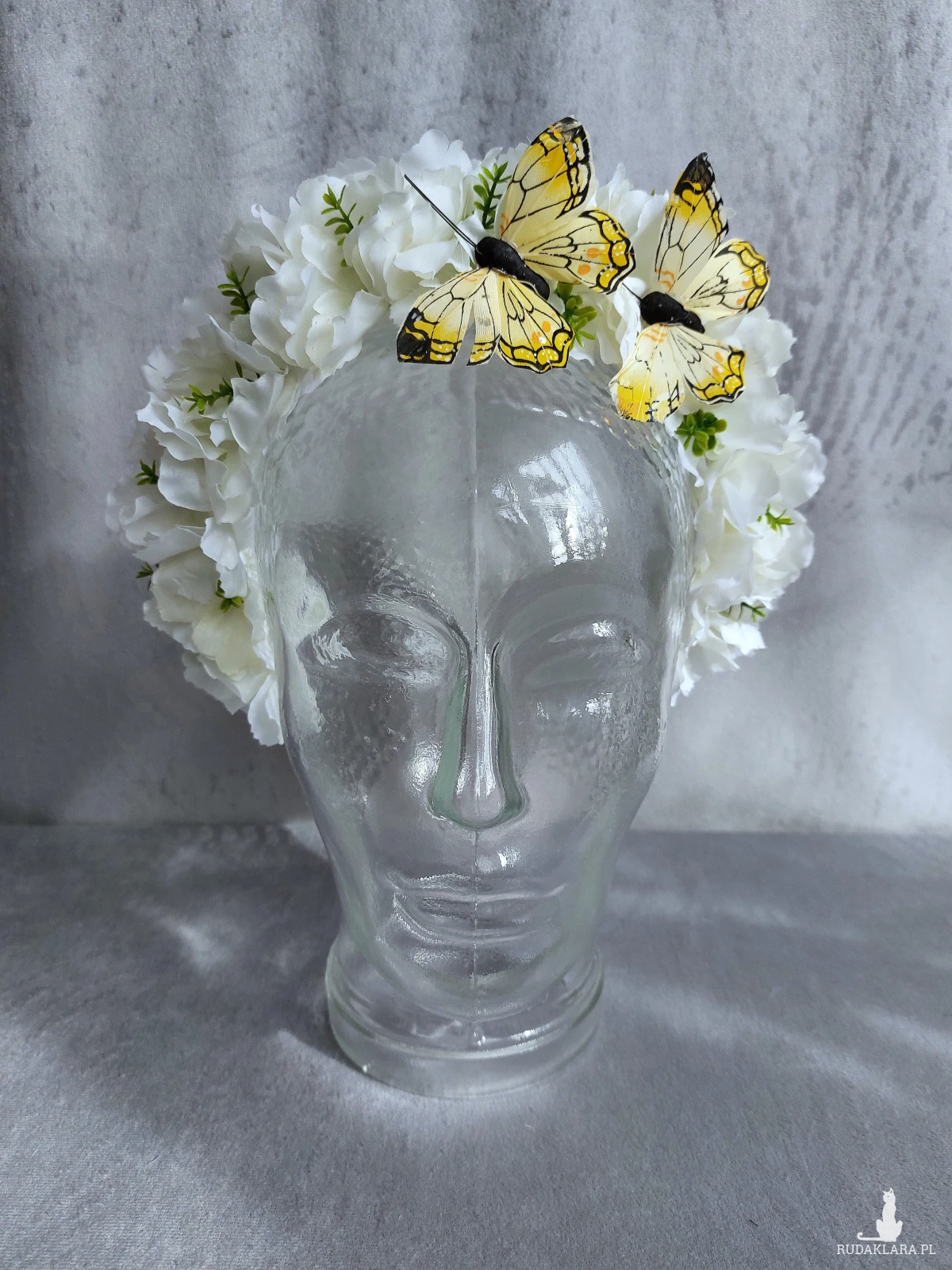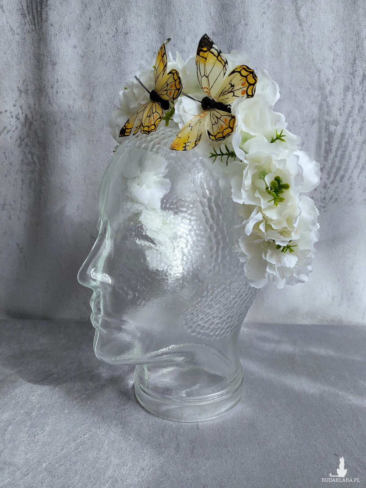 Kwiatowa opaska, wiosenny wianek wykonany z białych kwiatów jabłoni, ozdobiony dwoma żółtymi motylami. Kwiaty umocowane są na wygodnej opasce pokrytej satyną, Rozmiar uniwersalny, pasuje zarówno na dorosłą jak i na dziecięcą głowę.