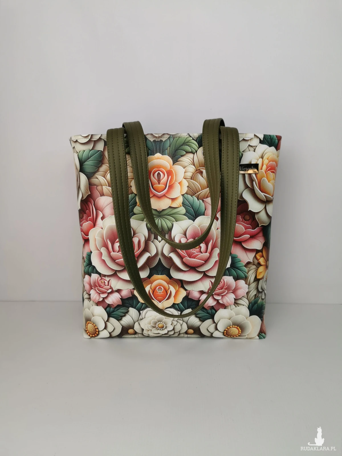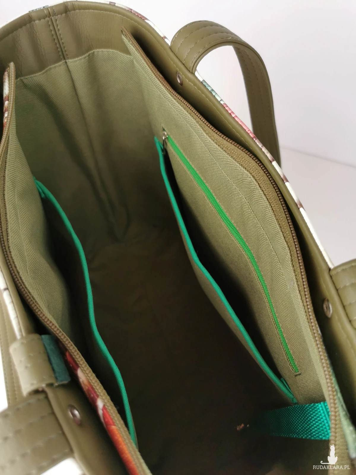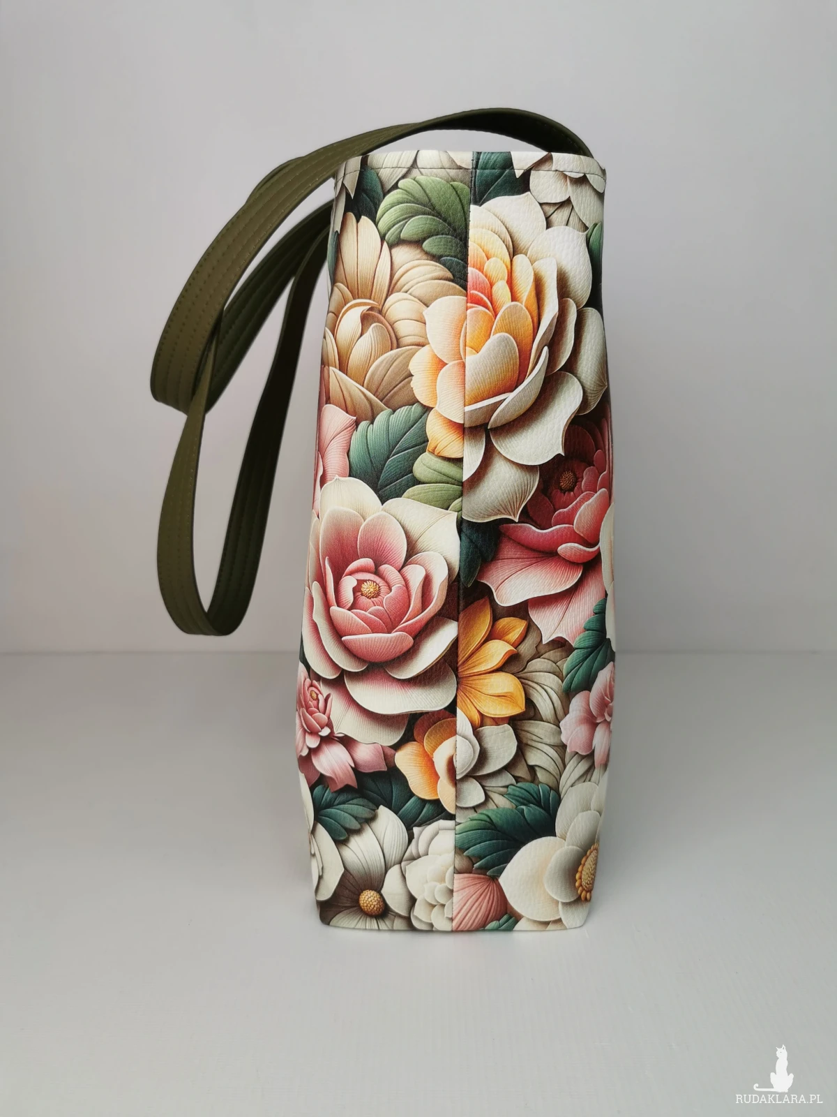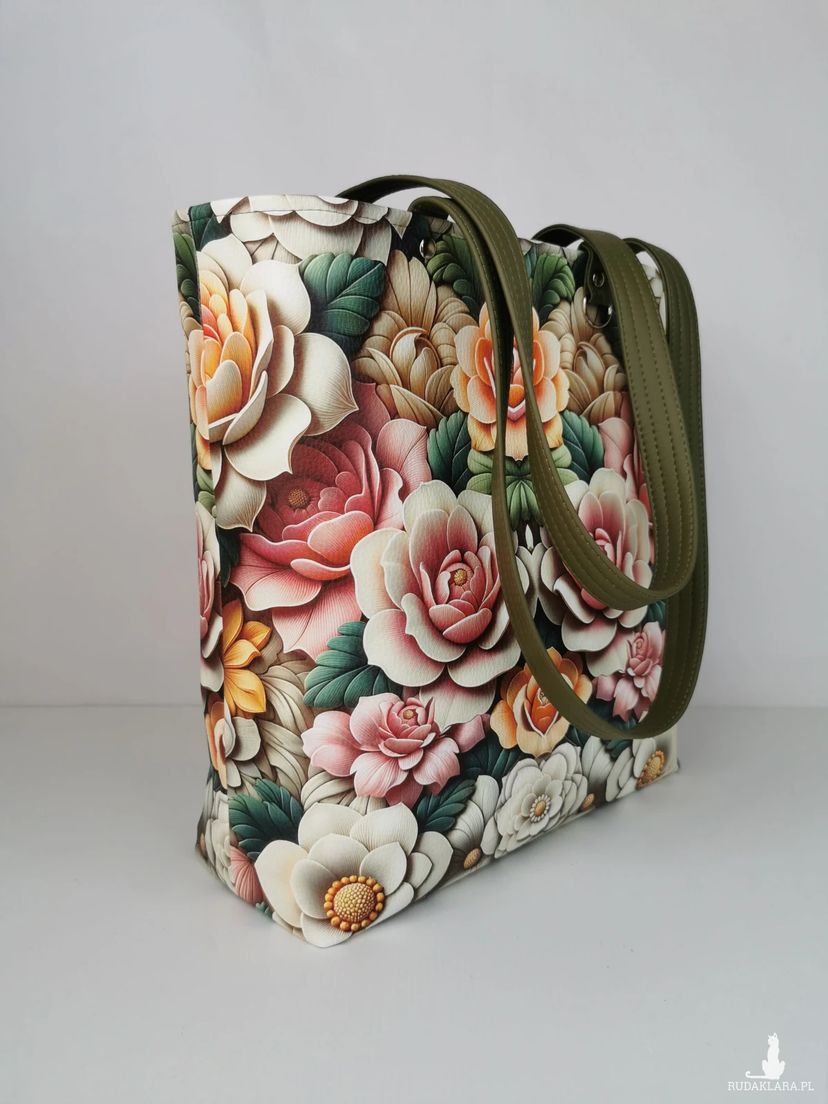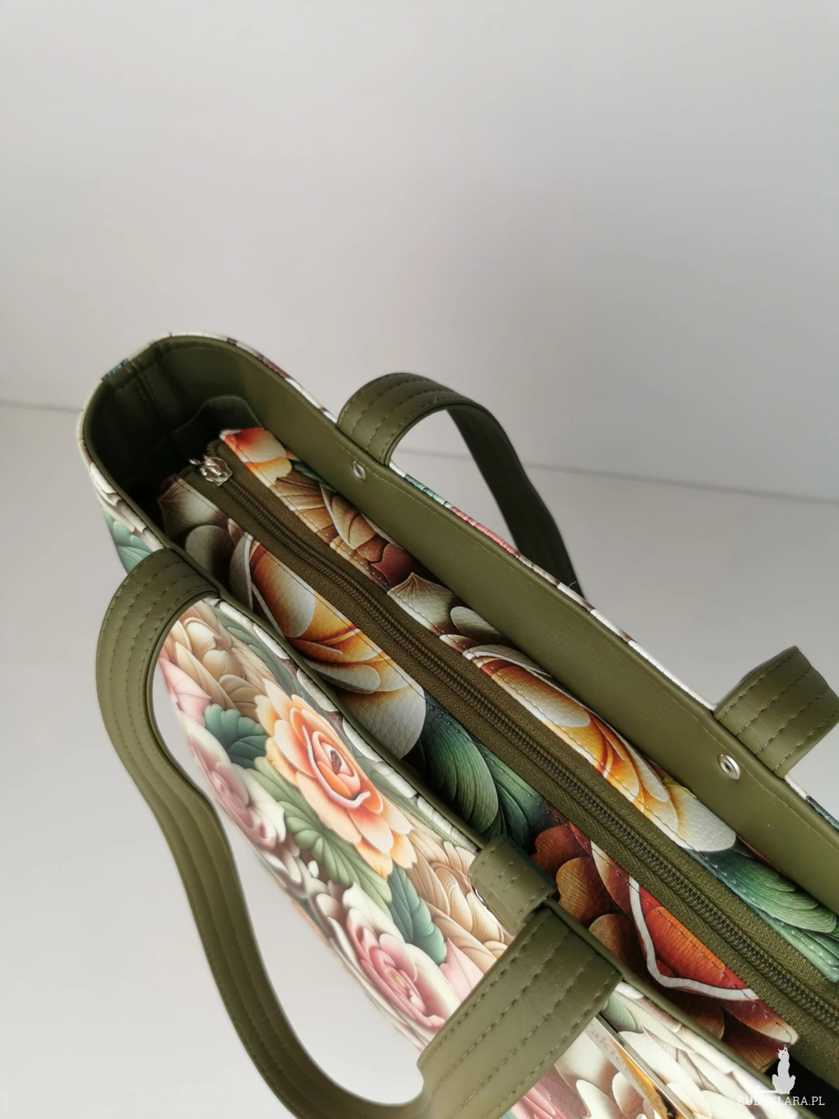 Wykonana z ekoskóry w kwiaty ( przód i tył torebki ) , uchwyty wykonane z gładkiej ekoskóry w kolorze zielonym / khaki .