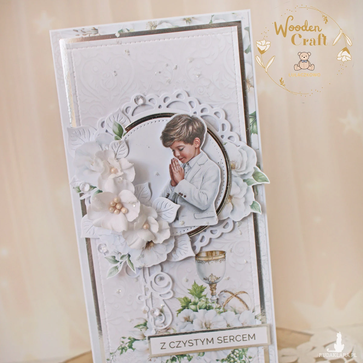 Piękna i elegancka pamiątka Pierwszej Komunii Świętej zamknięta w białym pudełeczku z okienkiem, wykonana ręcznie z najwyższą starannością, z cudownej i delikatnej kolekcji papierów "Holy Communion 4", utrzymana w odcieniach bieli oraz zieleni z dodatkiem srebrnych, błyszczących akcentów. Na środku kartki umieszona została grafika modlącego się chłopca komunijnego, ozdobiona kompozycją kwiatową z ręcznie robionymi kwiatami, udekorowana kryształkami oraz napisem "Z Czystym Sercem"