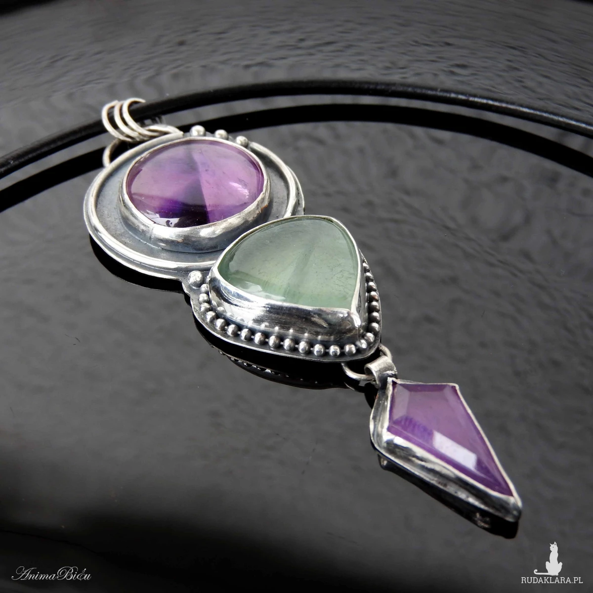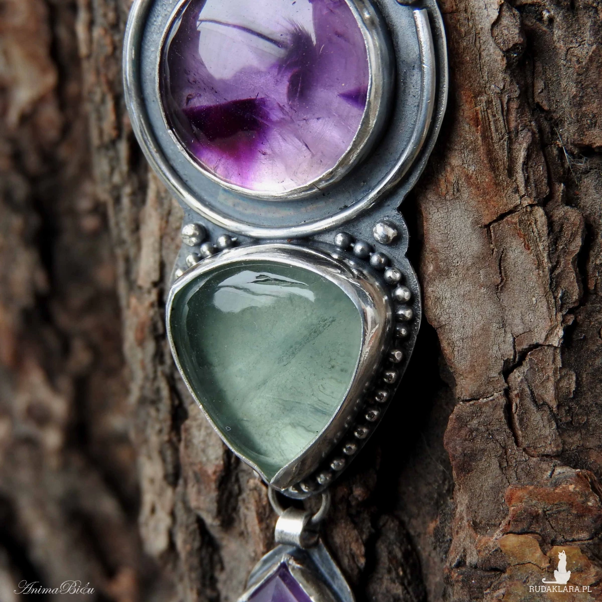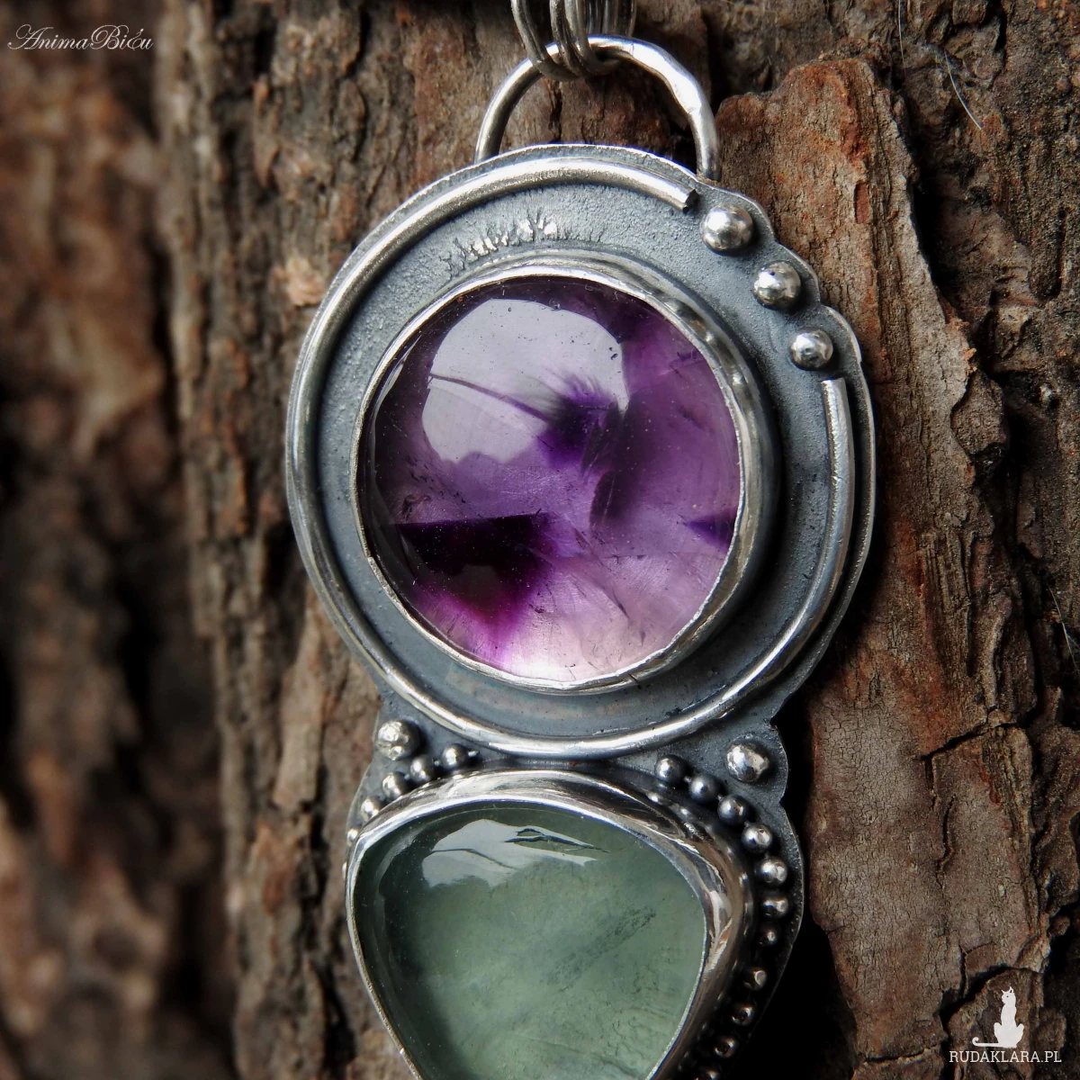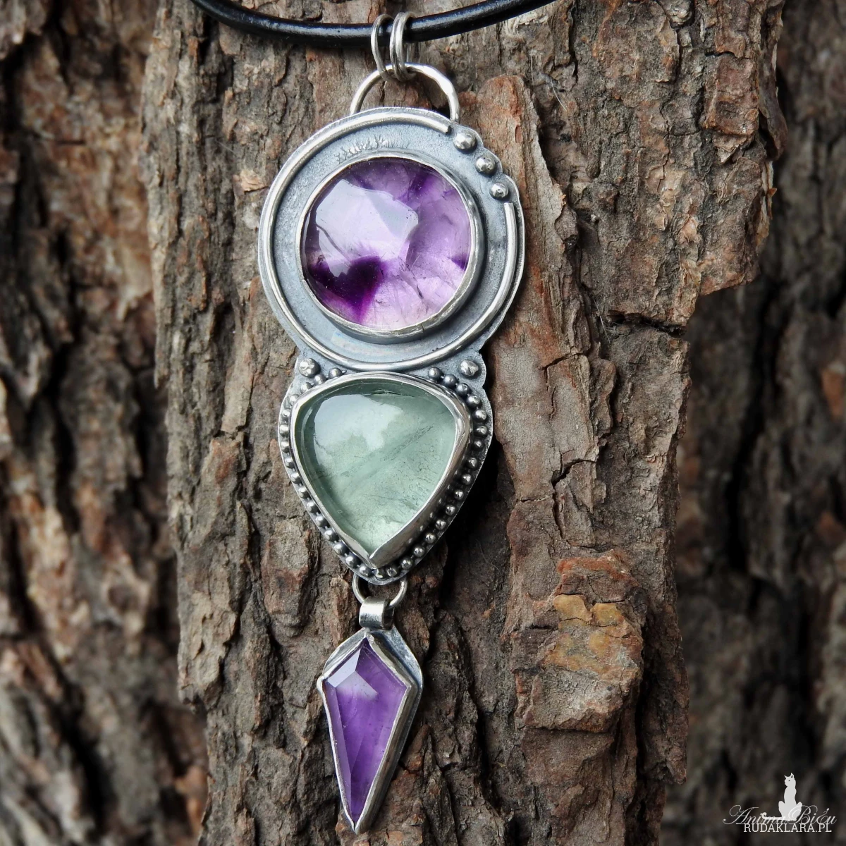 Wisiorek srebrny z ametystem i fluorytem. Wykonałam go od