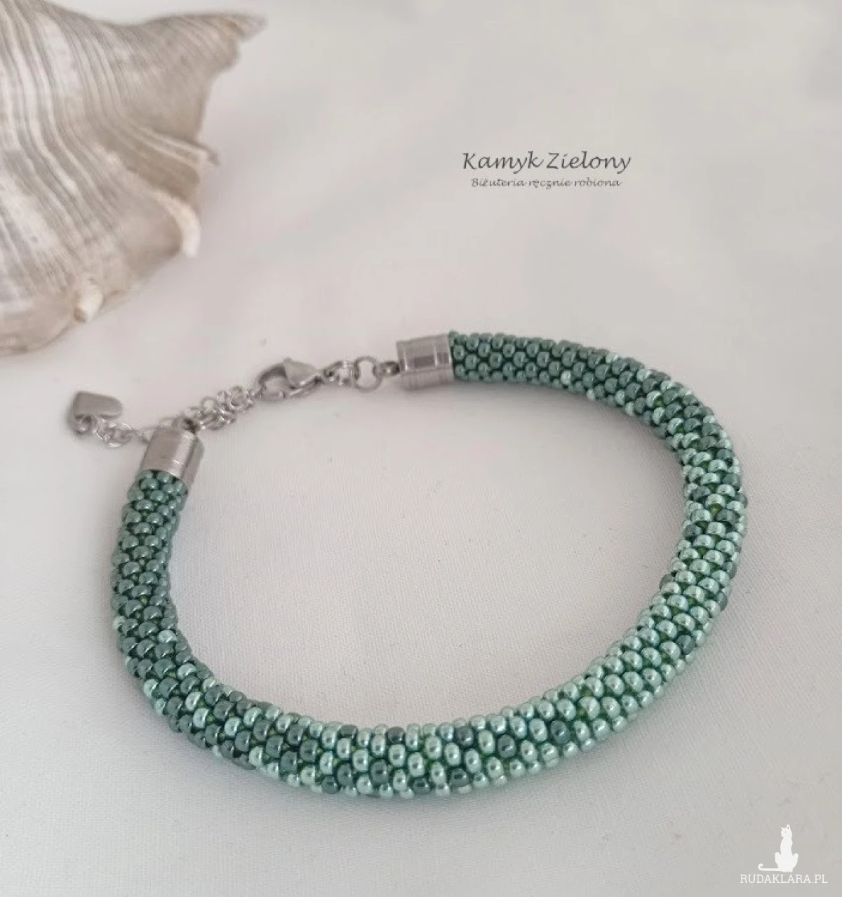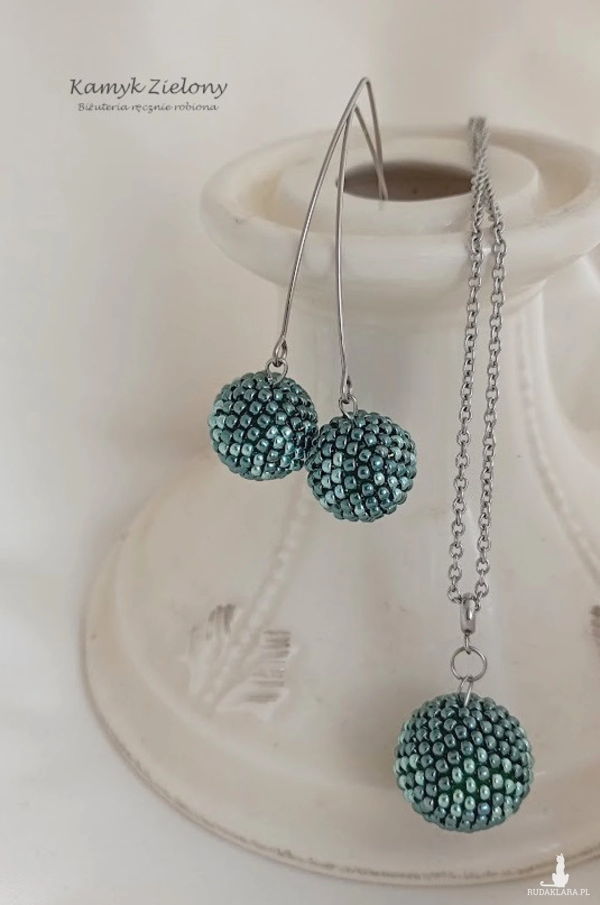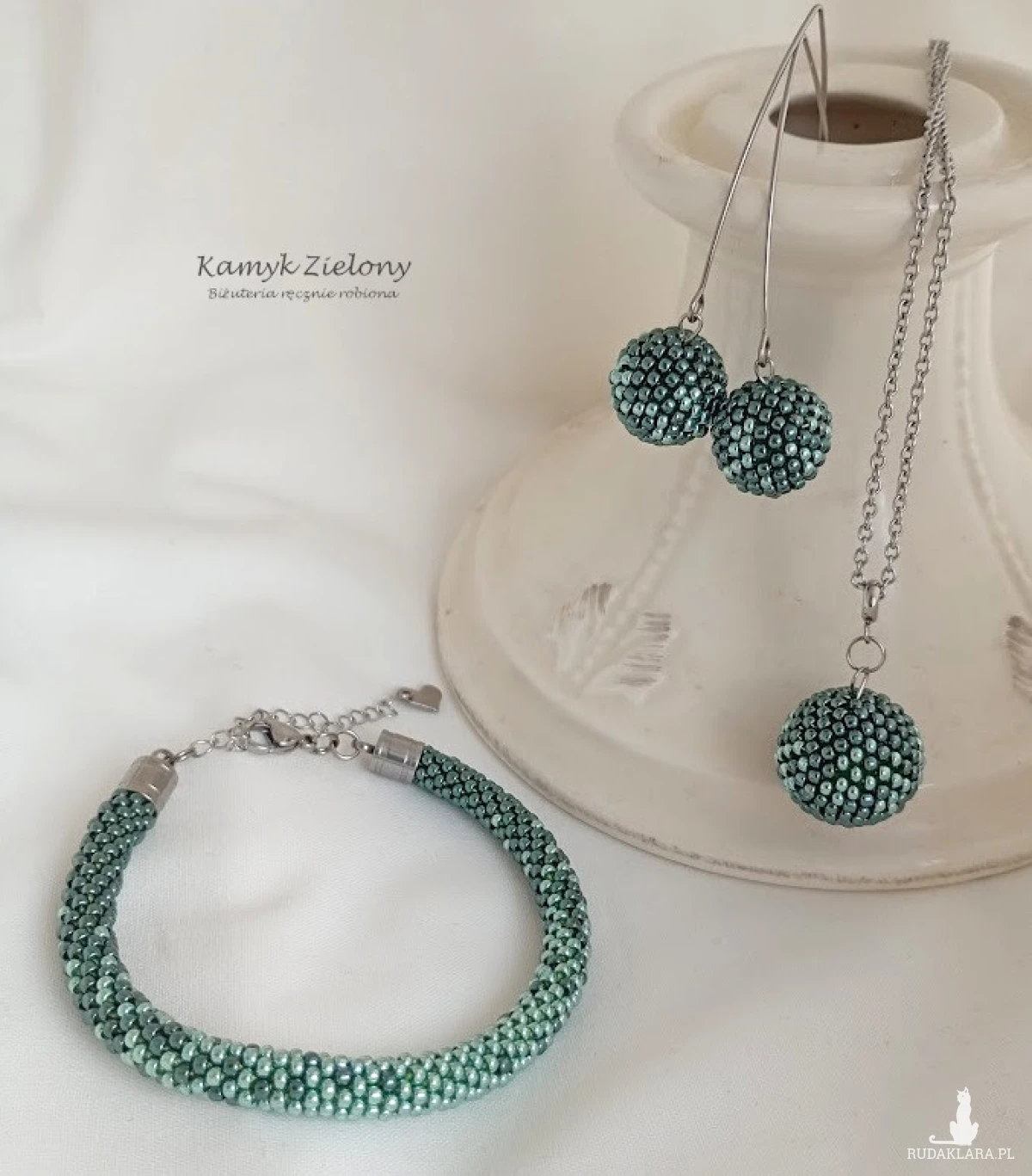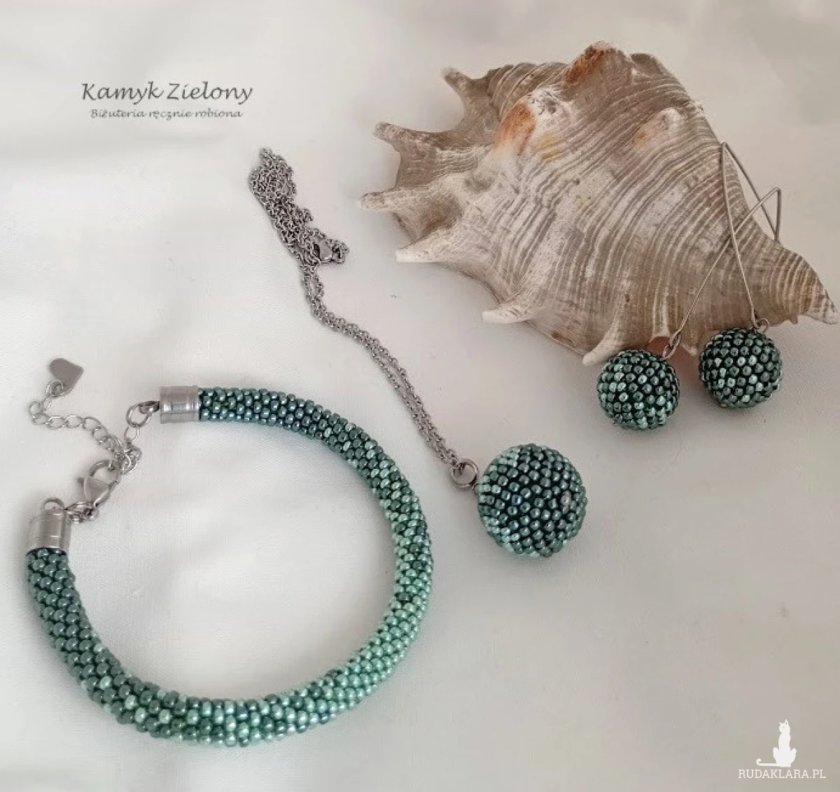 Powstał z doskonałej jakości koralików Toho oraz Miyuki. Do wykonania biżuterii użyte zostały koraliki w wersji metalizowanej, w przypadku których warstwa zielonego koloru została naniesiona metodą galwanizowania, dzięki czemu kolor koralików jest trwały, nie ściera się, ani nie ulega wyblaknięciu w trakcie użytkowania zrobionej z nich biżuterii.