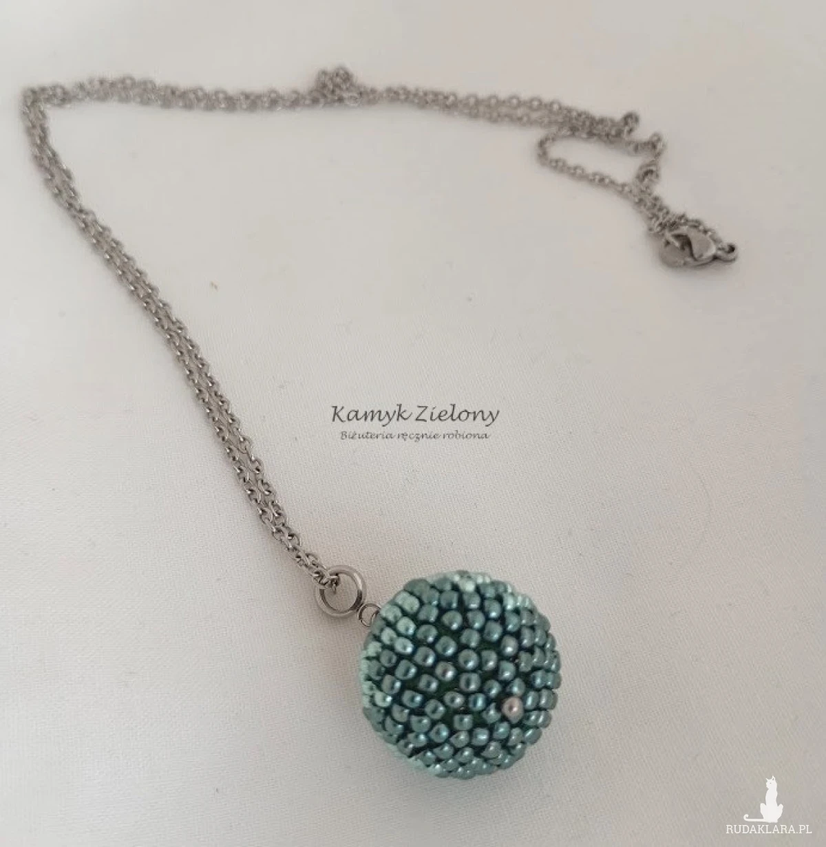 Zawieszka ma formę dużej koralikowej kulki ze stalową, okrągłą krawatką, którą zawieszono na łańcuszku ze stali chirurgicznej.