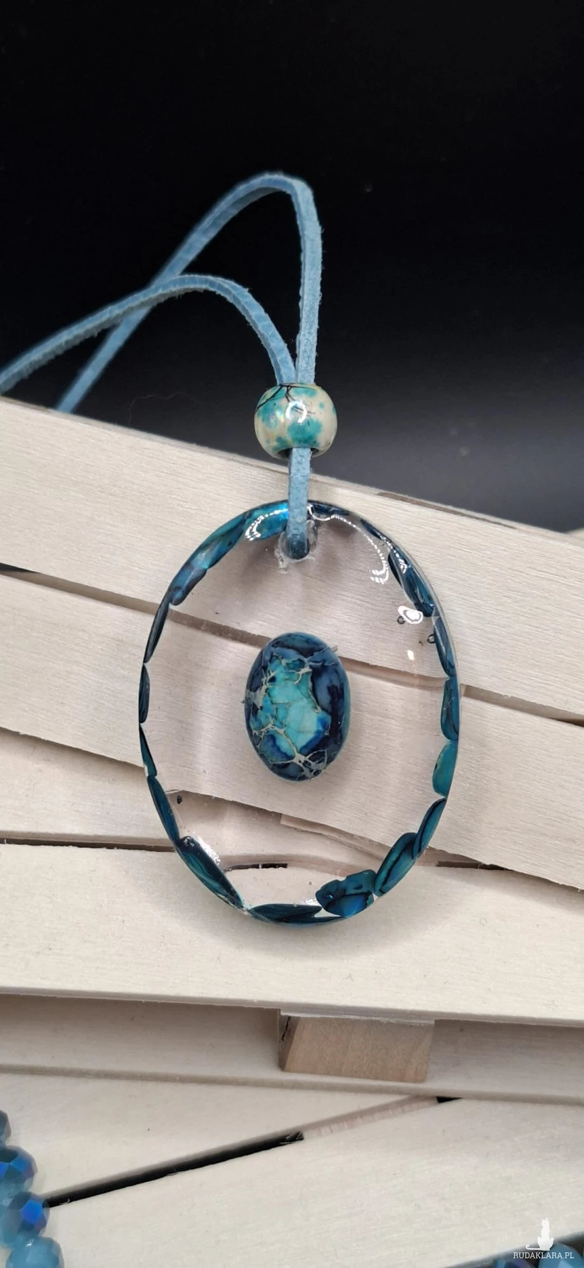 Centralnym elementem jest owalna zawieszka z zatopionym kamieniem w odcieniach turkusu i granatu, przypominającym strukturę naturalnego minerału. Całość została wykończona delikatną ramką w turkusowym kolorze, która podkreśla głębię kompozycji. Zawieszka zawieszona jest na dopasowanym, jasnoniebieskim rzemieniu z ozdobnym koralikiem.