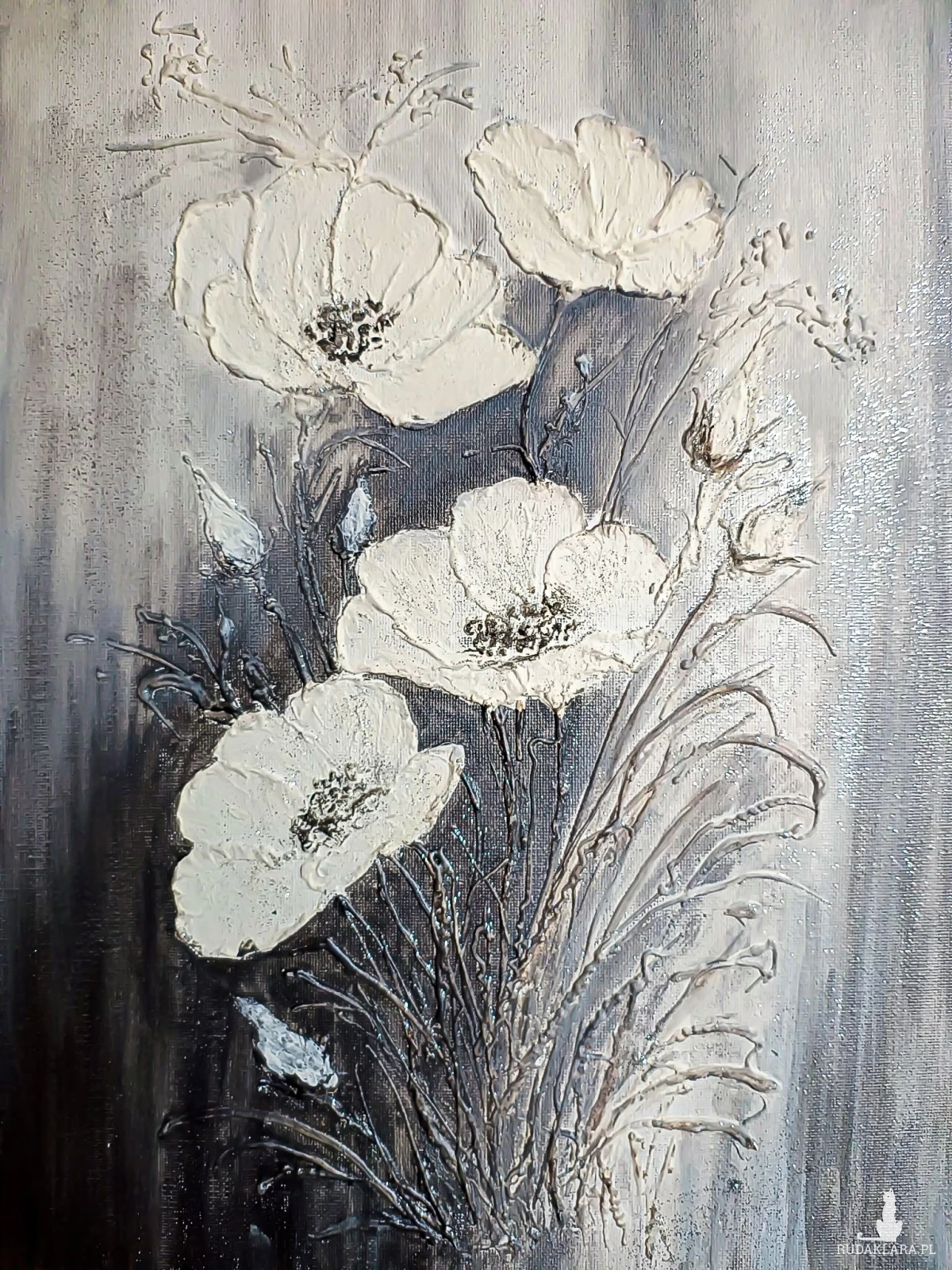 Kwiaty zostały naniesione grubą warstwą pasty strukturalnej, dzięki czemu dosłownie "wychodzą z płótna". Obraz pięknie pracuje ze światłem, zmieniając swój wygląd w zależności od pory dnia. Praca została stworzona z myślą o wnętrzach, w których sztuka ma być nie tylko dekoracją, ale i namacalnym doświadczeniem. Każdy egzemplarz jest niepowtarzalny i jedyny w swoim rodzaju. Nie jest to wydruk, lecz autorskie dzieło z wyraźnym śladem ręki artysty.
