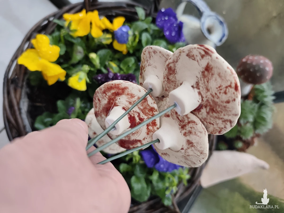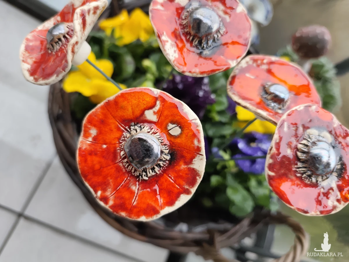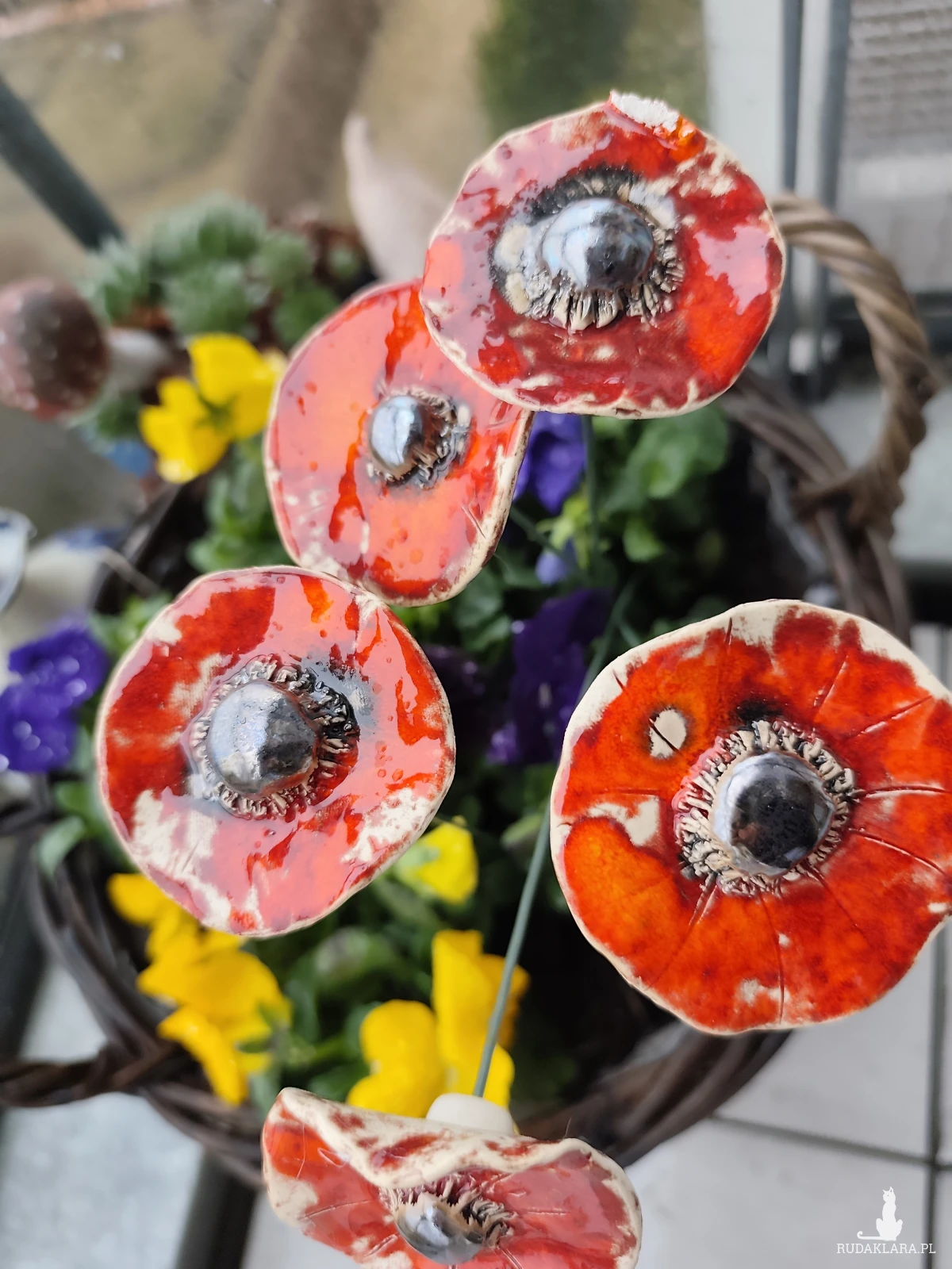 Kwiaty ceramiczne 5 szt, wykonane ręcznie z gliny szamotowej, szkliwione i dwukrotnie wypalane w piecu ceramicznym na 1050 stopni. Polecam do domu, na balkon lub do ogrodu. Średnica około 6 cm. Nie przekwitają :)