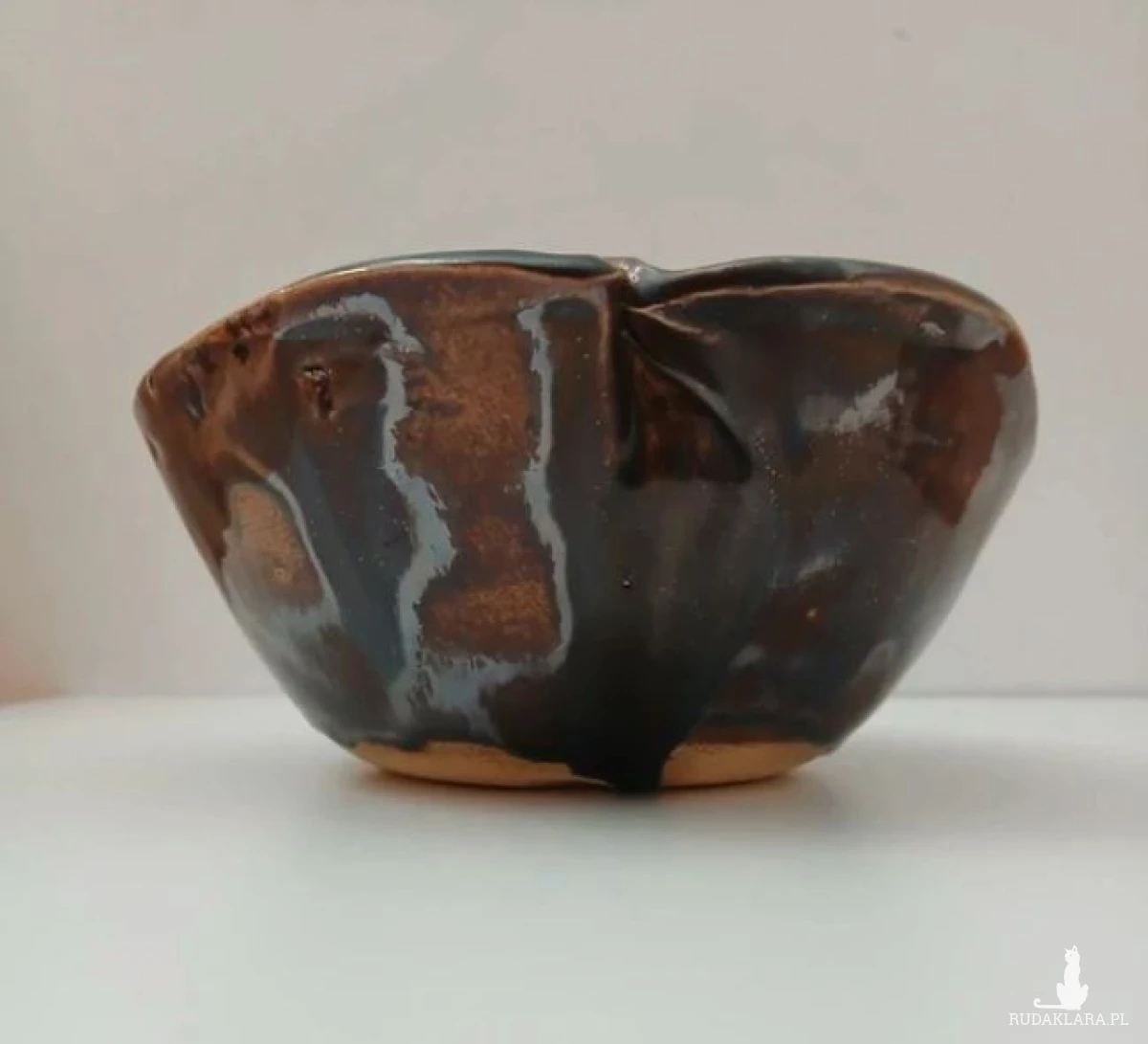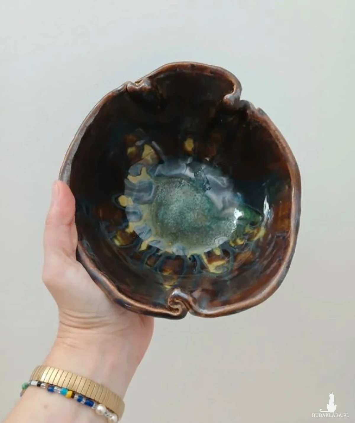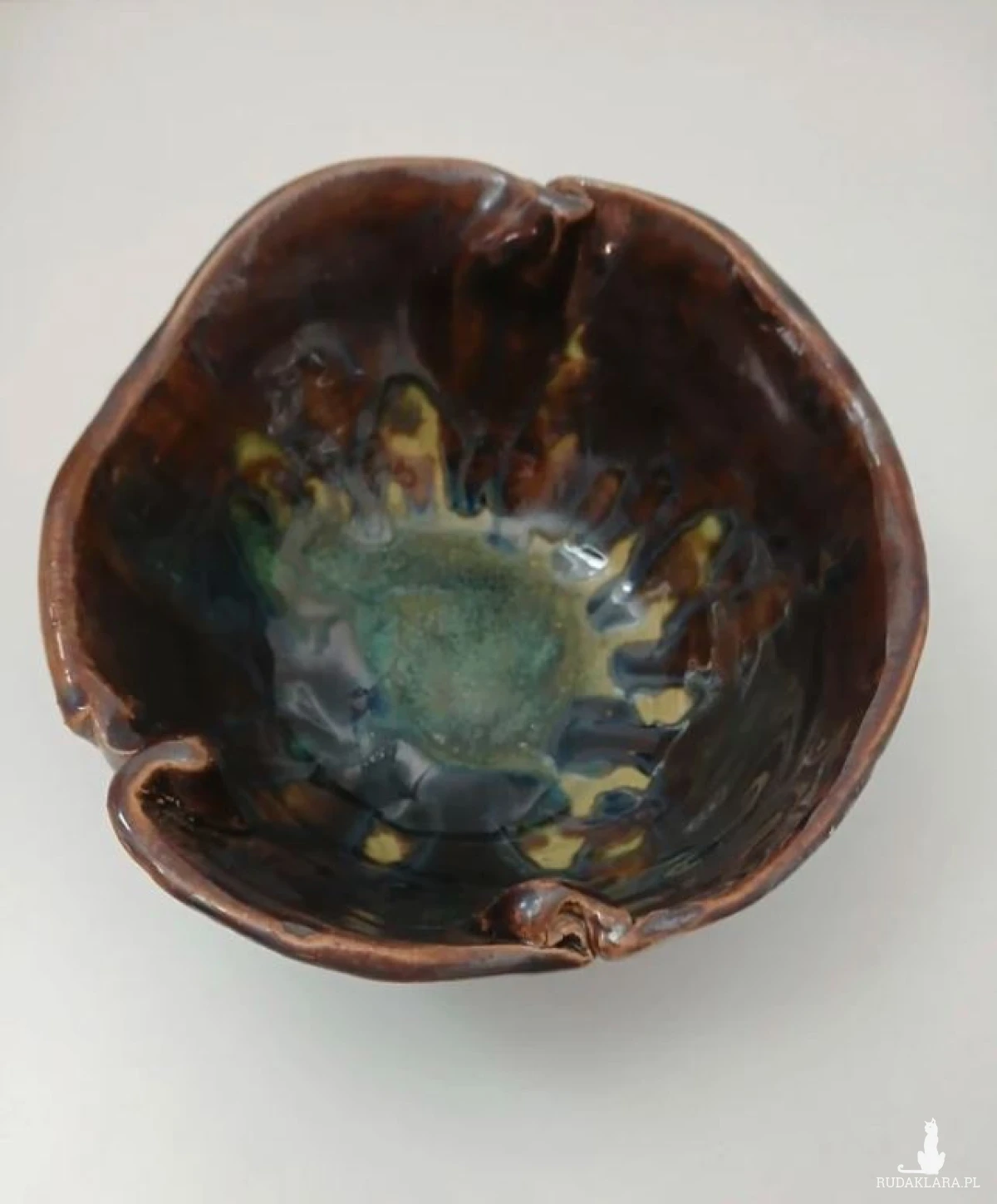 Ręcznie lepiona gliniana miska na owoce lub do serwowania przekąsek, miska na biżuterię i inne drobiazgi, ceramiczna patera na przekąski nieregularne pofalowane brzegi przypominają kwiat, złoto - brązowe szkliwo z zielonymi akcentami, dwukrotnie wypalana w piecu, szkliwa spożywcze wysokość 7cm średnica 15cm