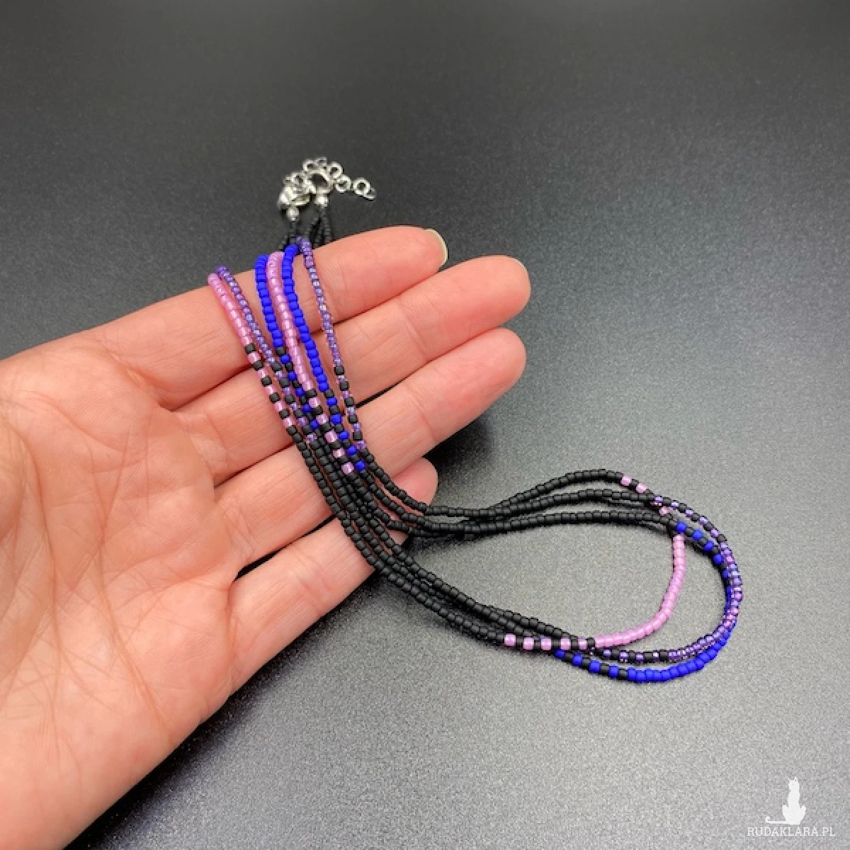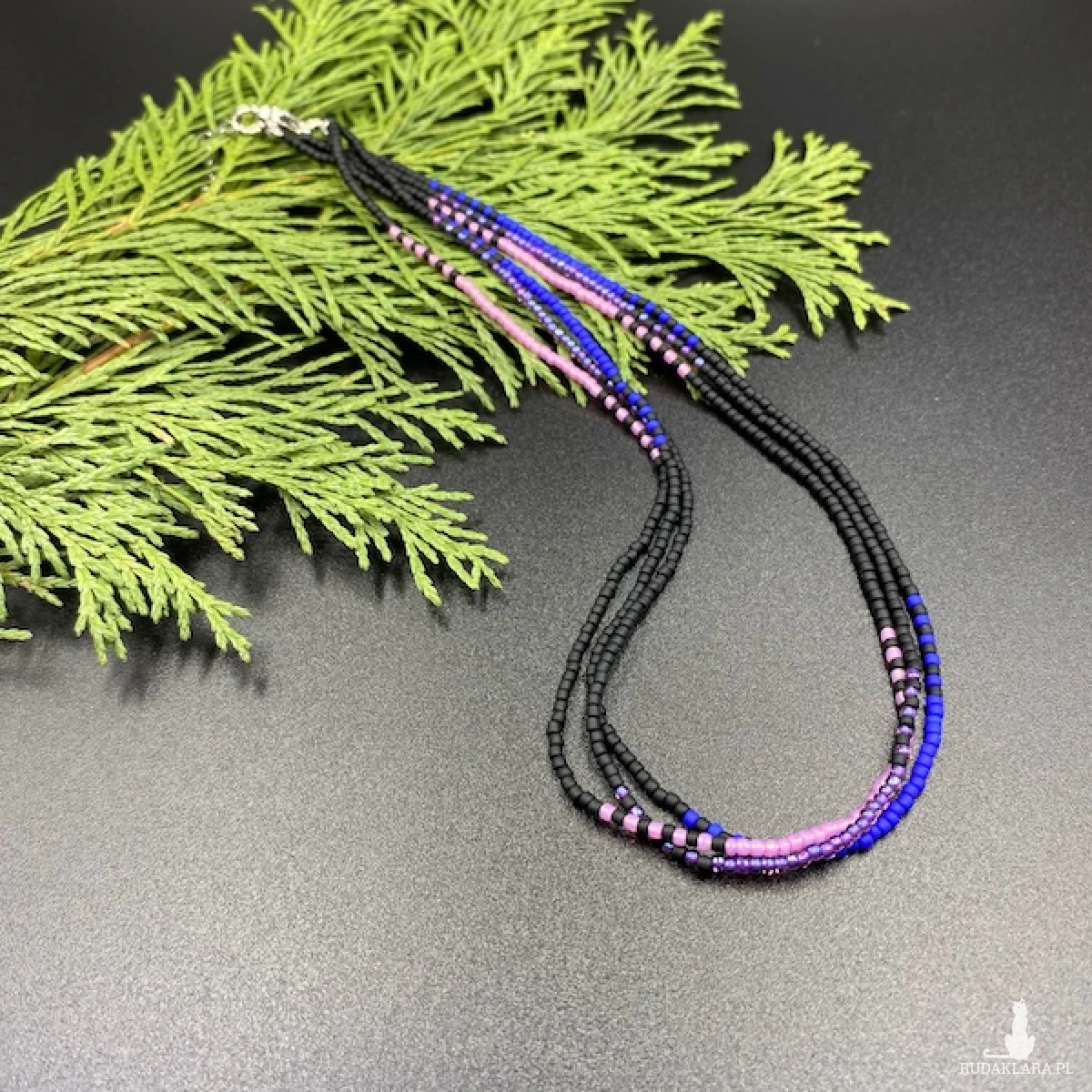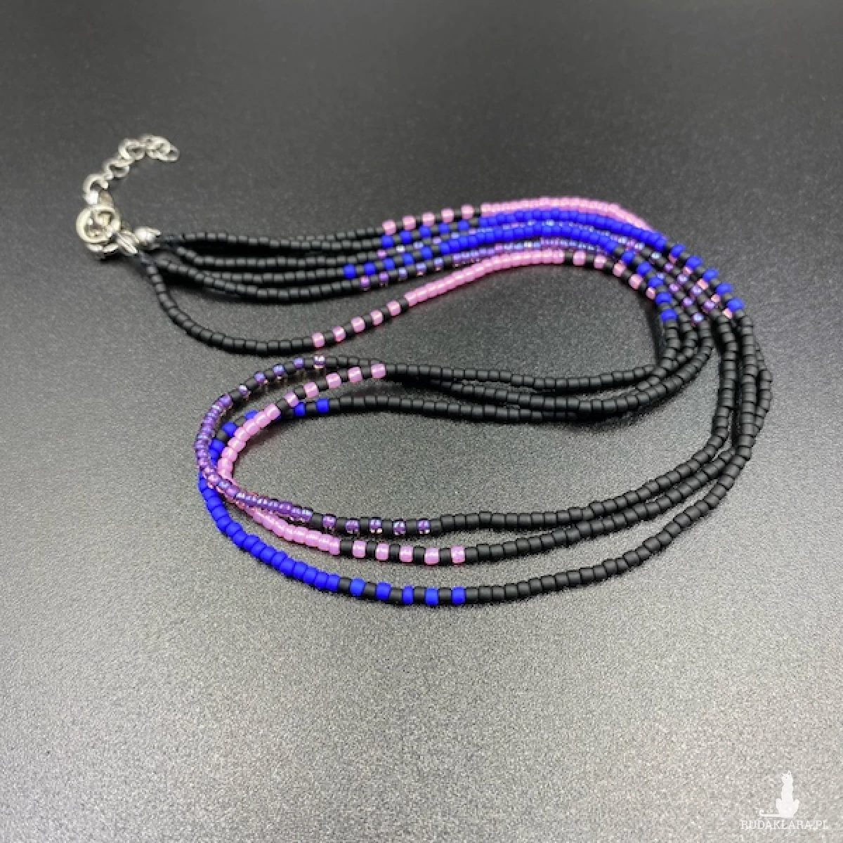 Krótki naszyjnik ( złożony z trzech sznurów ) został wykonany ręcznie ze szklanych koralików w kolorze; czarnym, chabrowym, różowym i fioletowym.Elementy metalowe ze stali chirurgicznej w kolorze srebrnym.