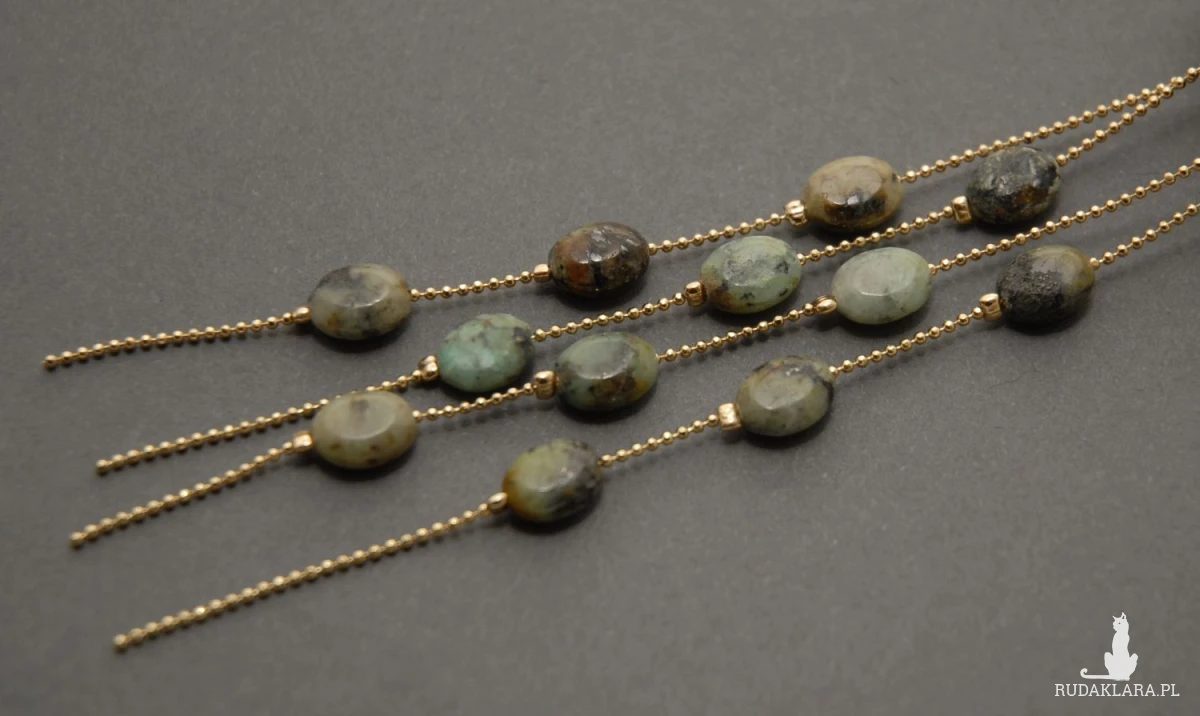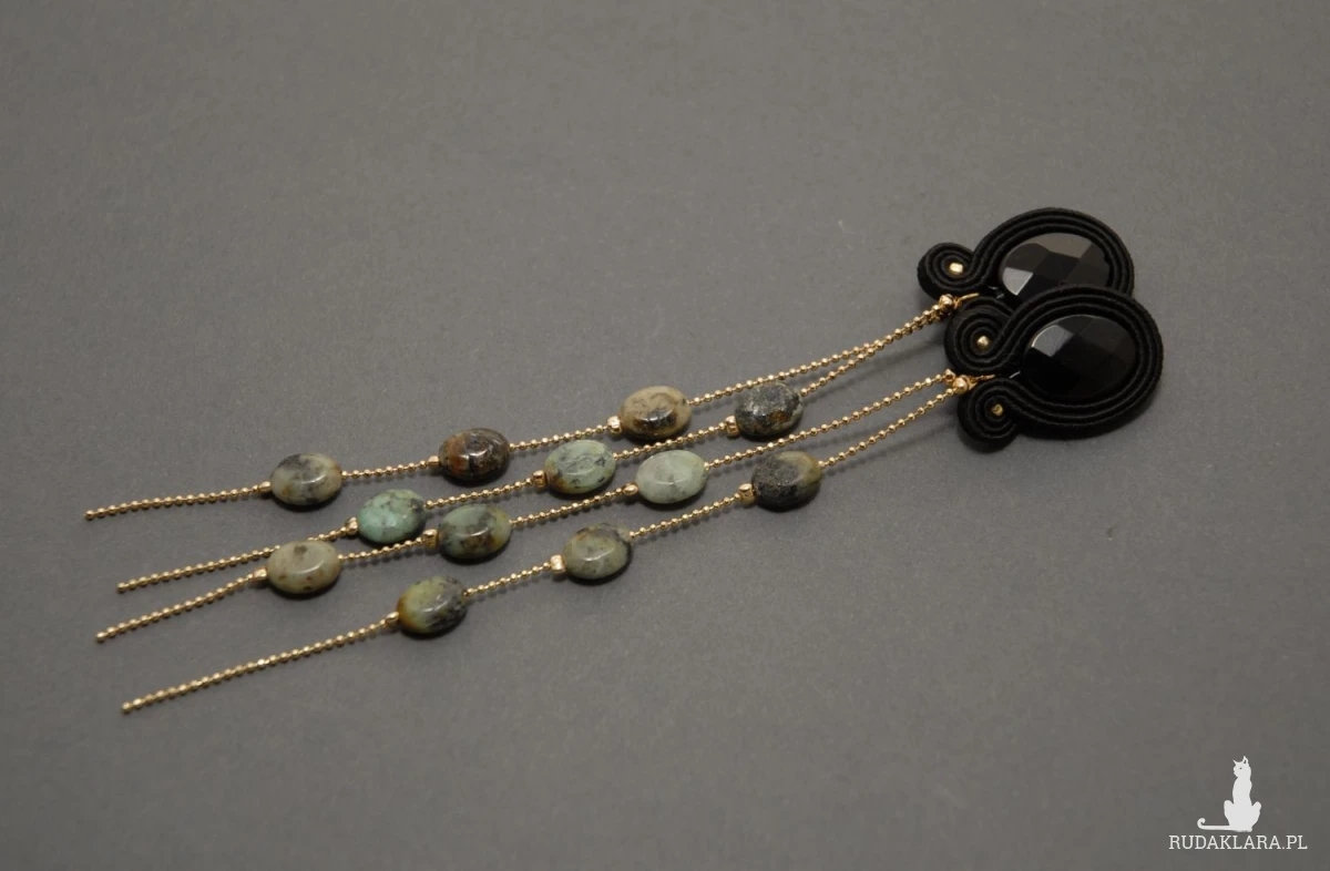 Kolczyki zrobione techniką sutasz, ozdobione dużymi, fasetowanymi onyksami i drobnymi turkusami. Drobne kamyki zamontowane są na pozłacanym łańcuszku.